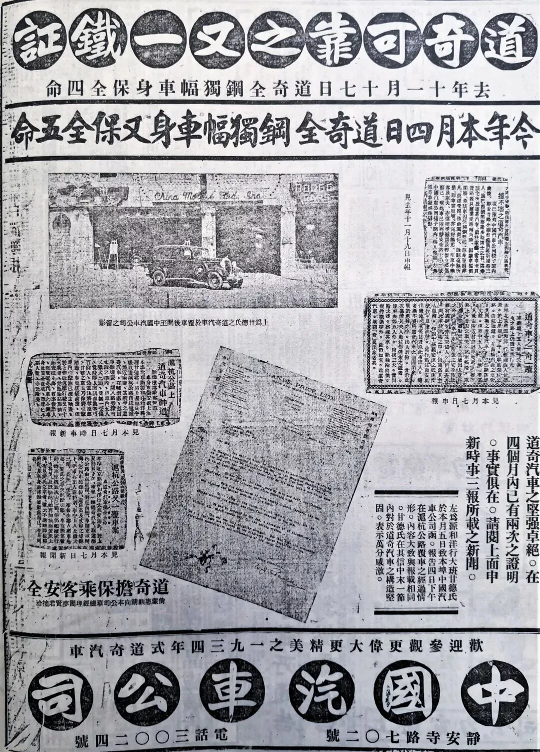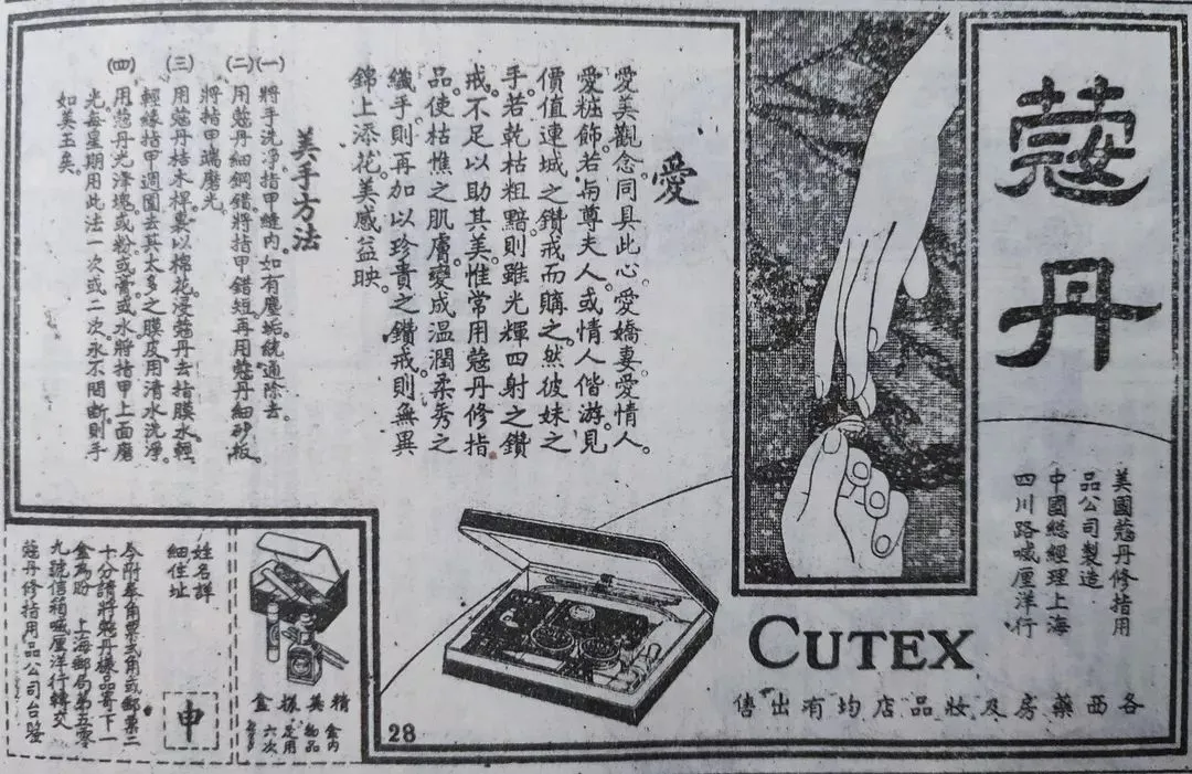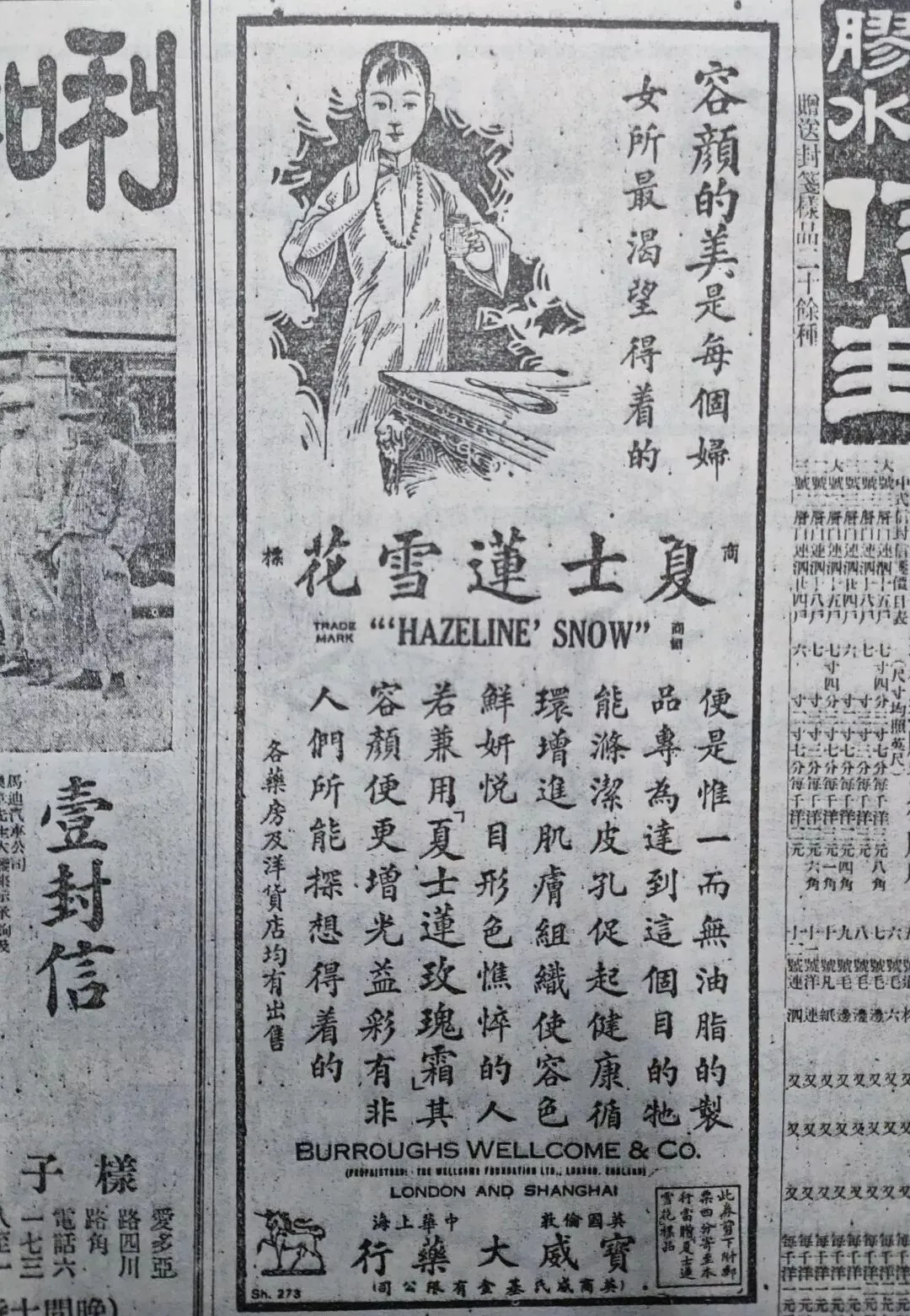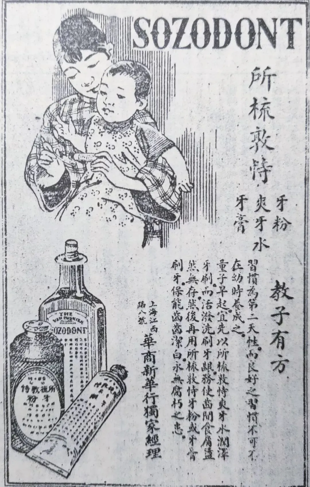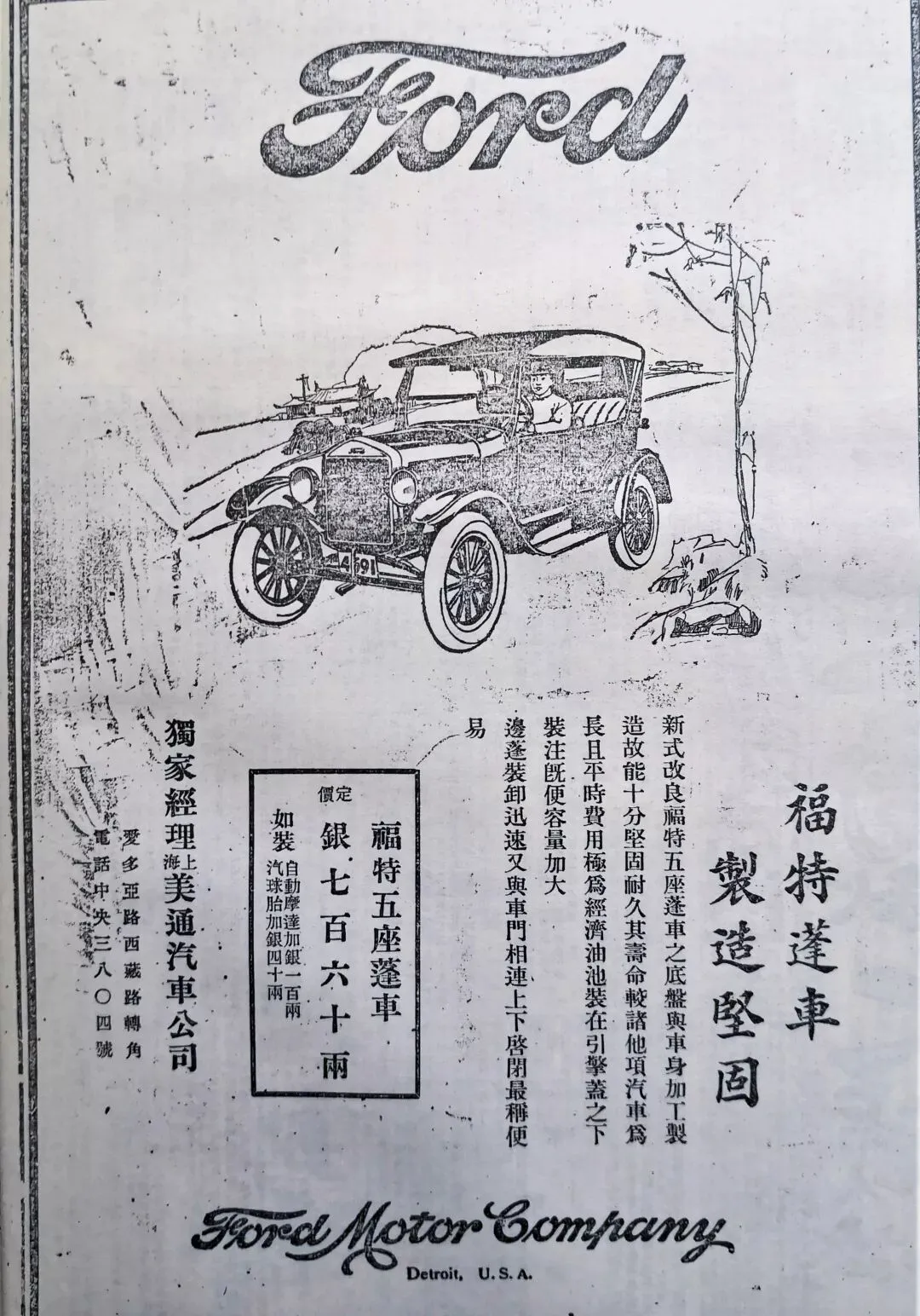 1927年12月1日所梳敦恃牙膏、爽牙水、牙粉“保能齿齿洁白,永无腐朽之患”。1925年4月19日凡士林生发香膏“能生发永无脱落之患”。1936年6月20日力士香皂“明星用之美容的香皂”。1920年11月14日兜安氏美容膏“皮肤益显光彩矣”。1930年6月22日美国蔻丹修指用品“彼妹之手,若干枯粗黯,则虽光辉四射之钻戒,不足以助其美”。1937年6月18日双妹老牌爽身粉、花露水“深闺姊妹应珍重,到处衣香惹蝶怜”。1929年6月22日夏士莲雪花膏“容颜的美是每个妇女最渴望得着的”。1937年6月19日必素定牙膏“促进爱情”。1926年6月3日杀虫药水“蟑螂虽毒,吾人可高枕无忧”。1933年4月5日冠生园饮食部鲜明虾“暮春时节以此为下酒物其风味盎然矣”。1930年1月22日冠生园糖果年糕礼品市场“新增欧式果盘”。1925年10月15日飞鹰老牌炼乳“强身健力,老幼咸宜”。1930年1月23日三桶牌三星白兰地“风行全球数十余载”。1923年1月15日果汁牛肉“中外人士,皆配胃口”。1933年6月20日正广和汽水“请畅饮之,卫生有益”。1937年6月18日正广和汽水“大众需要之饮品”。1921年5月9日红色清道丸“阁下之口气惹人厌恶否”。1922年11月4日艾罗补脑汁“世界愈文明,生存竞争愈剧烈”。1932年6月19日克雷斯香烟“漂亮名媛爱吸克雷斯香烟之一斑”。1921年11月25日金马牌香烟“香烟之有金马,犹诸鸟有凤而鱼有鲲”。亨茂汽车公司1926年9月3日在《申报》上的广告:“真正的愉快不是常可以得到的。君若购壁克汽车一辆,就可以时常得到真正的愉快。”1925年4月18日《申报》刊登的马斯律汽车广告:“随时随地无不适用。”1934年3月12日道奇车的整版广告:“去年11月17日道奇全钢独幅车身保全四命”,还配上了名人乘坐道奇汽车的留影照片。1921年2月27日,麦克斯威尔汽车的广告仅用超大字号标注价格,没有多余的标语,主要还是用漫画突出其敞篷车型。福特汽车1926年9月3日在《申报》上的漫画还画出了驾驶员和街道,更加有画面感。1921年2月8日,前后出现的出租汽车广告和汽车修理广告。