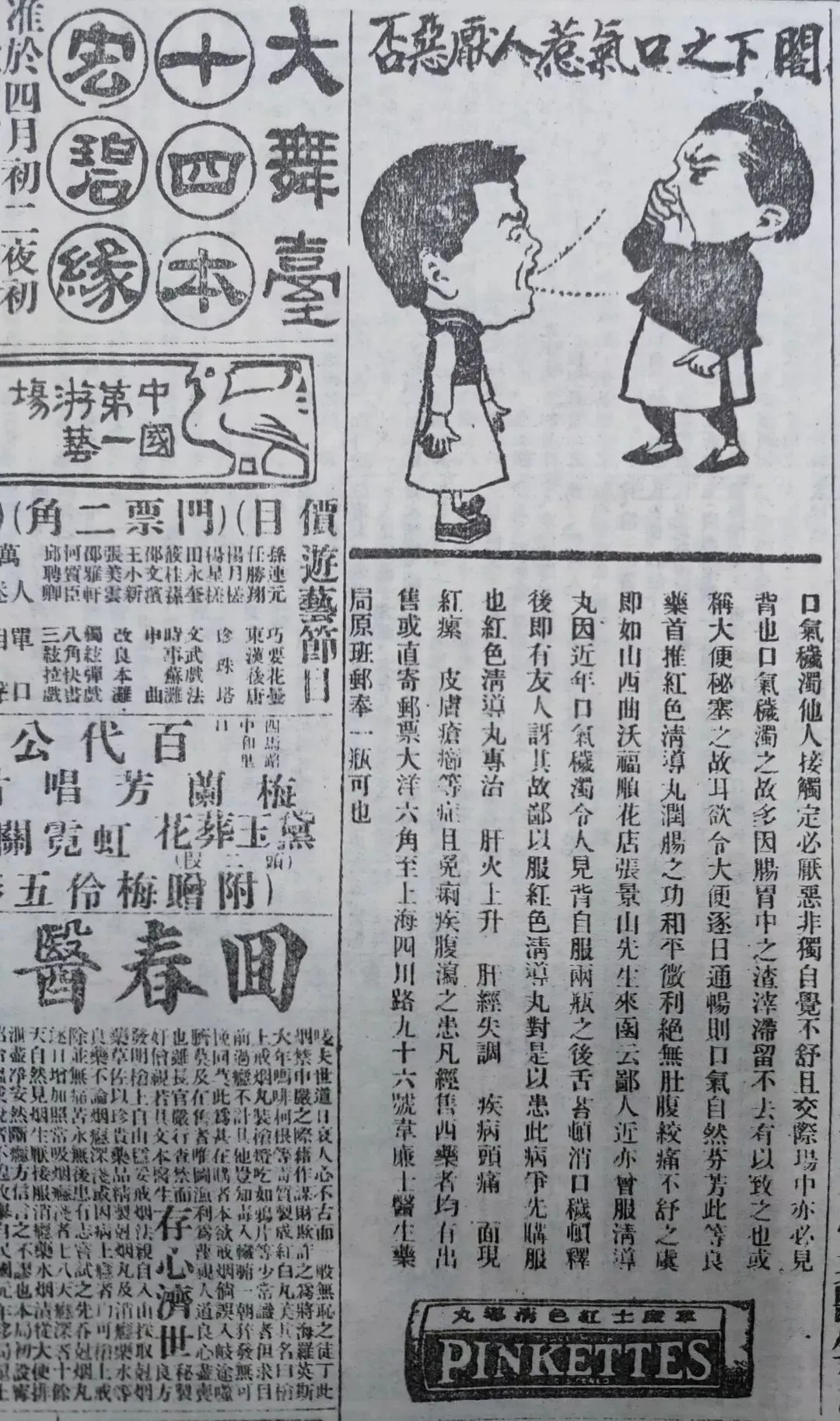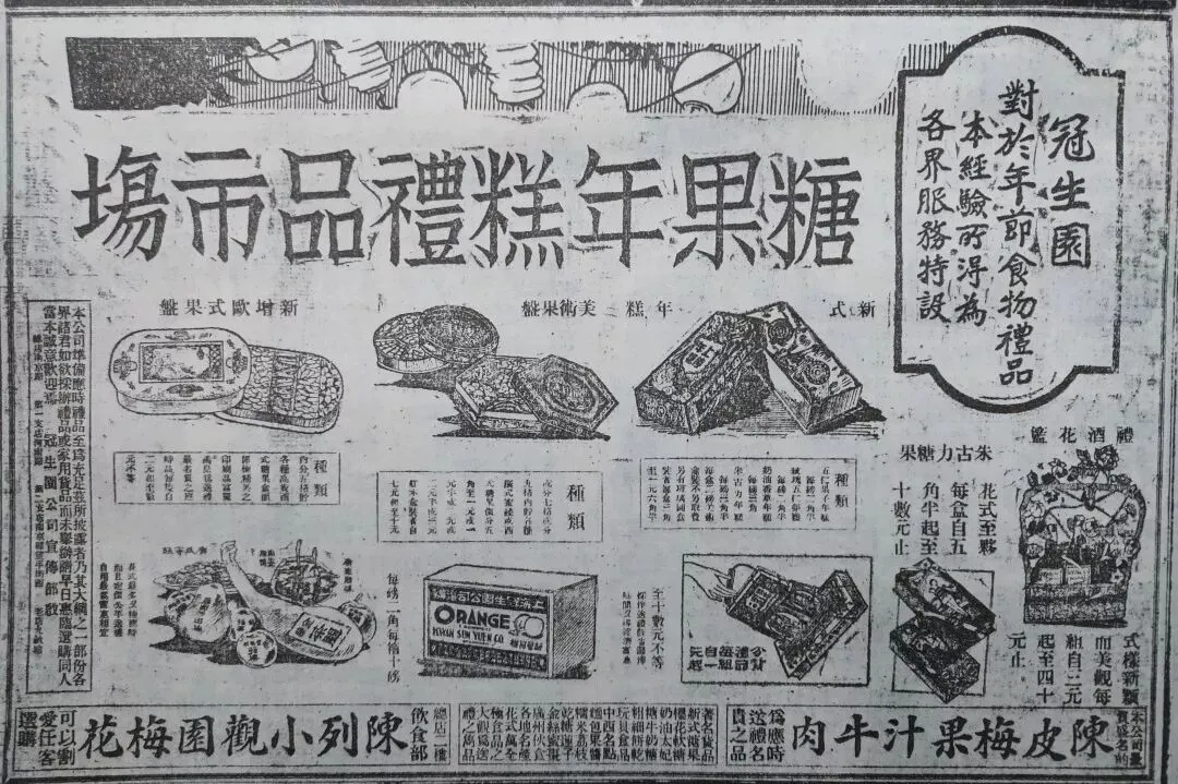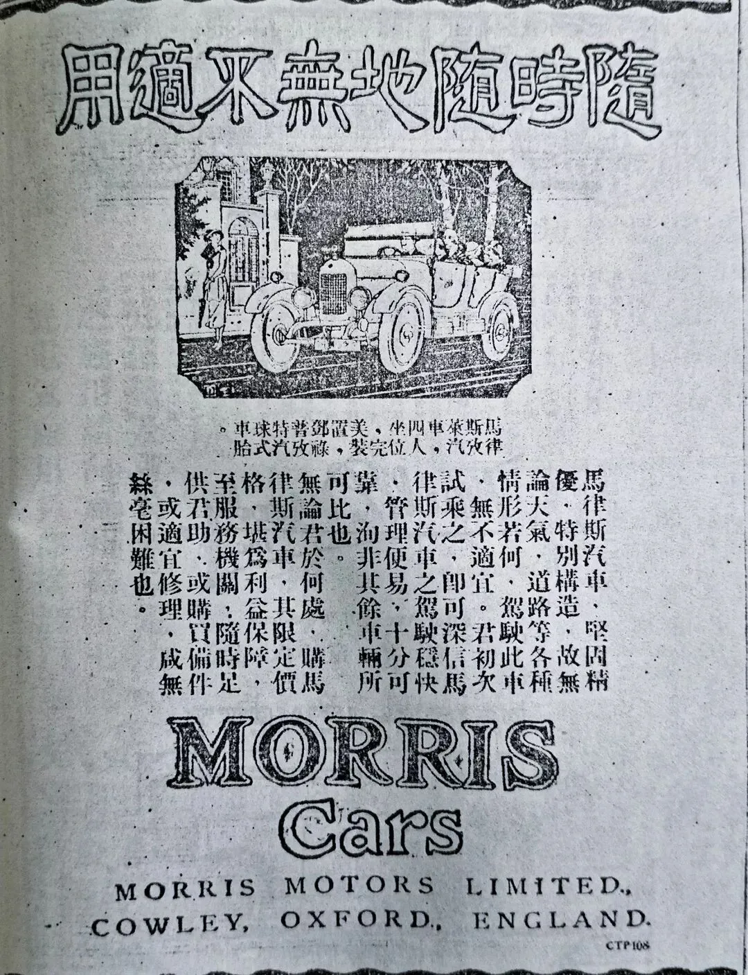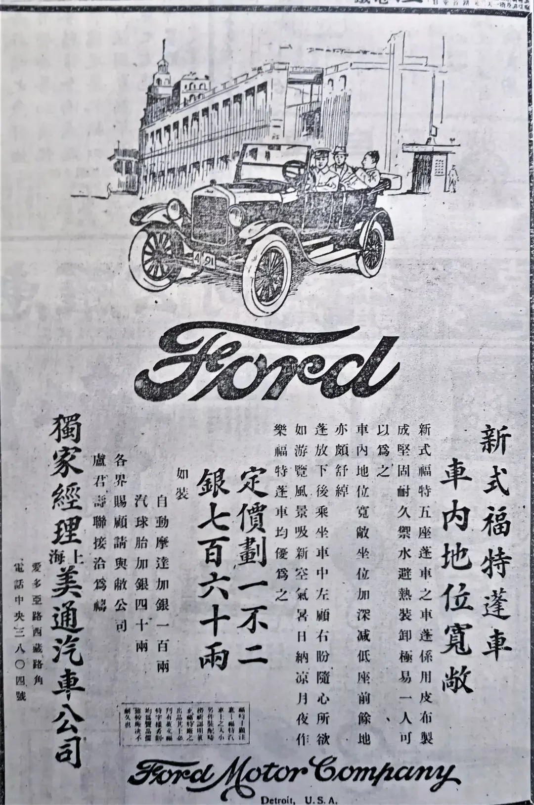 1927年12月1日所梳敦恃牙膏、爽牙水、牙粉“保能齿齿洁白,永无腐朽之患”。1925年4月19日凡士林生发香膏“能生发永无脱落之患”。1936年6月20日力士香皂“明星用之美容的香皂”。1920年11月14日兜安氏美容膏“皮肤益显光彩矣”。1930年6月22日美国蔻丹修指用品“彼妹之手,若干枯粗黯,则虽光辉四射之钻戒,不足以助其美”。1937年6月18日双妹老牌爽身粉、花露水“深闺姊妹应珍重,到处衣香惹蝶怜”。1929年6月22日夏士莲雪花膏“容颜的美是每个妇女最渴望得着的”。1937年6月19日必素定牙膏“促进爱情”。1926年6月3日杀虫药水“蟑螂虽毒,吾人可高枕无忧”。1933年4月5日冠生园饮食部鲜明虾“暮春时节以此为下酒物其风味盎然矣”。1930年1月22日冠生园糖果年糕礼品市场“新增欧式果盘”。1925年10月15日飞鹰老牌炼乳“强身健力,老幼咸宜”。1930年1月23日三桶牌三星白兰地“风行全球数十余载”。1923年1月15日果汁牛肉“中外人士,皆配胃口”。1933年6月20日正广和汽水“请畅饮之,卫生有益”。1937年6月18日正广和汽水“大众需要之饮品”。1921年5月9日红色清道丸“阁下之口气惹人厌恶否”。1922年11月4日艾罗补脑汁“世界愈文明,生存竞争愈剧烈”。1932年6月19日克雷斯香烟“漂亮名媛爱吸克雷斯香烟之一斑”。1921年11月25日金马牌香烟“香烟之有金马,犹诸鸟有凤而鱼有鲲”。亨茂汽车公司1926年9月3日在《申报》上的广告:“真正的愉快不是常可以得到的。君若购壁克汽车一辆,就可以时常得到真正的愉快。”1925年4月18日《申报》刊登的马斯律汽车广告:“随时随地无不适用。”1934年3月12日道奇车的整版广告:“去年11月17日道奇全钢独幅车身保全四命”,还配上了名人乘坐道奇汽车的留影照片。1921年2月27日,麦克斯威尔汽车的广告仅用超大字号标注价格,没有多余的标语,主要还是用漫画突出其敞篷车型。福特汽车1926年9月3日在《申报》上的漫画还画出了驾驶员和街道,更加有画面感。1921年2月8日,前后出现的出租汽车广告和汽车修理广告。