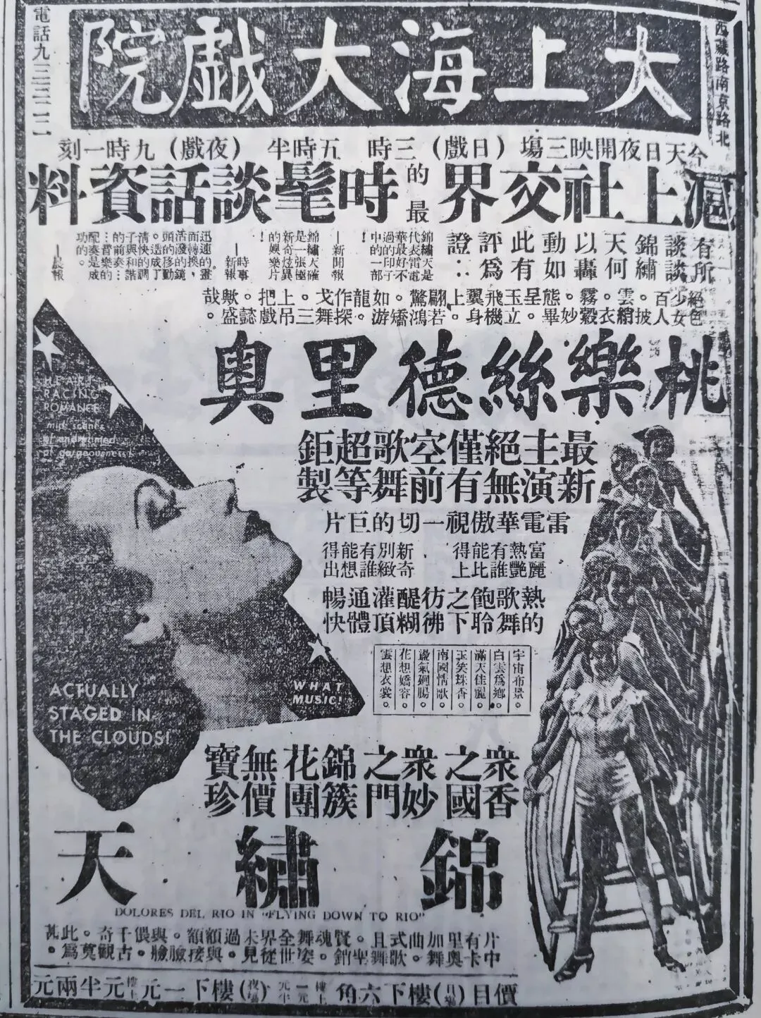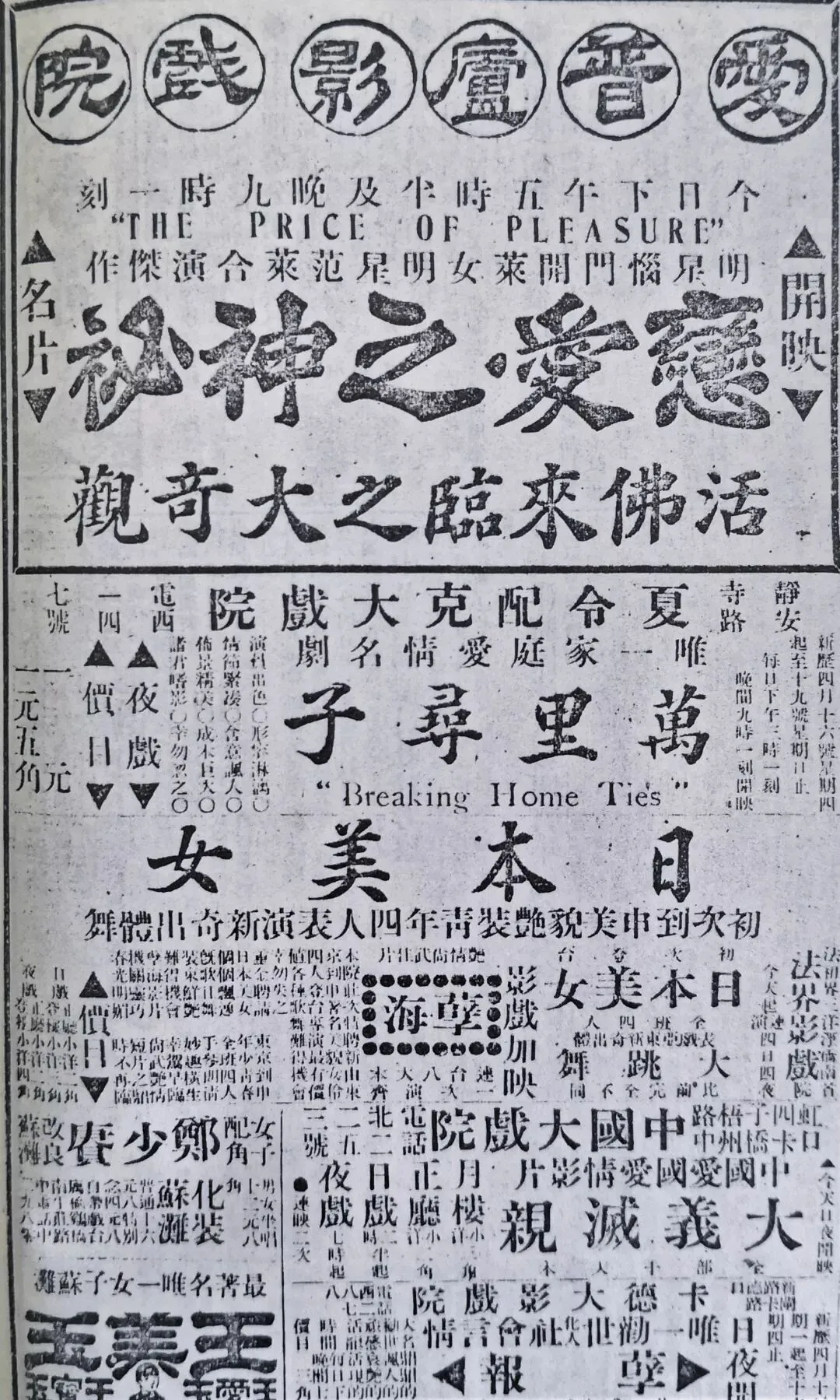 1931年1月1日刊登的中国搬家公司广告,每个小时4元,另配搬夫4人。福特敞篷车1926年4月7日的广告标语:“乘坐车中,左顾右盼,随心所欲,如游览风景,吸新空气,夏日纳凉,月夜作乐”。1924年4月16日,《申报》上出现的《恋爱之神秘——活佛来临之大奇观》,下面的“日本美女”吸引眼球。1934年3月11日,桃乐丝·德里奥主演电影被包装成“沪上社交界的最时髦谈话资料”,据称其“最新主演绝无仅有,空前歌舞超等巨制”,是“傲视一切的巨片”。1937年6月19日,“舆论基于最高评价,卖座拥挤不衰”的噱头,大概可以与今天的豆瓣9.0媲美。1937年6月19日,大东跳舞厅“这环境这情调真够沉醉!舞侣是这么娇滴滴,地板是这么滑溜溜,广寒仙宫也不过如此!”1931年1月31日,柯达家庭电影镜箱广告呈现的美好图景。