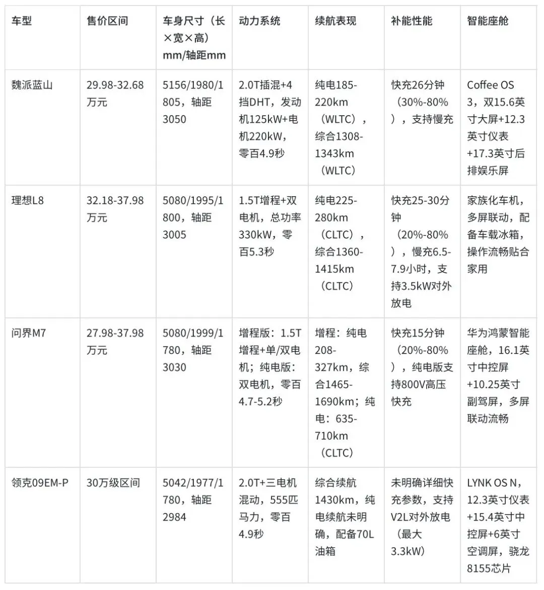 本次聚焦四款热门中型/中大型SUV——魏派蓝山、理想L8、问界M7、领克09EM-P,从售价、尺寸、动力、智能等核心维度全面解析,帮你精准匹配家庭用车需求。