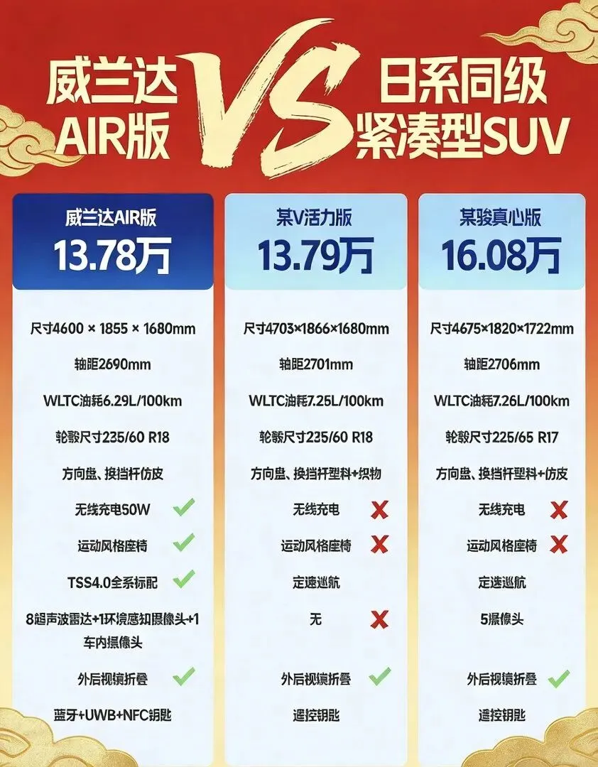 威兰达AIR版推出两款车型,汽油两驱AIR版权益价13.78万元,双擎两驱AIR版14.78万,精准卡在13-15万的家用SUV市场。