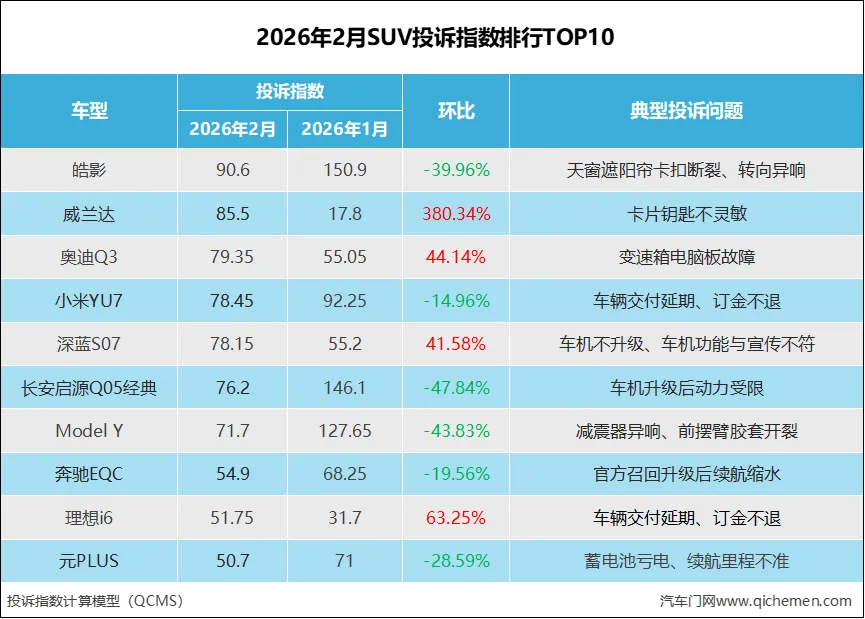 2026年2月SUV投诉指数排行:某合资车冲上前三
