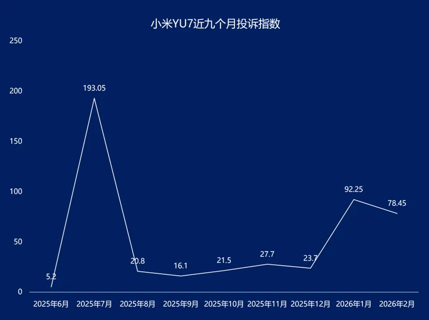 汽车质量投诉点评:2月,小米YU7的投诉指数环比下滑了14.96%,上榜原因主要集中在车辆交付延期、订金不退。从近九个月的投诉趋势来看,该问题的投诉指数在2025年7月达到峰值后便一直下滑。尽管今年1月投诉指数出现小幅回升,但整体规模仍处于较低水平。