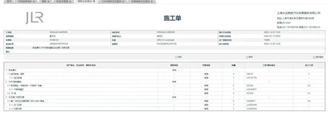 帮忙君从沈女士提供的2022年维修施工单看到,工单号为RASHL2212290039,维修项目明确包含“前挡漫水”相关的挡风玻璃更换,维修类型标注为“保修”。