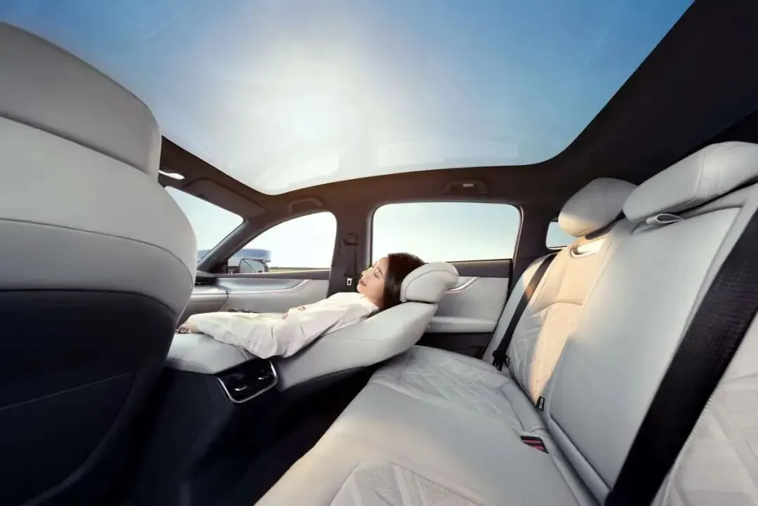 它的后排体验堪称“移动休憩舱”:超大全景天幕让阳光倾泻而入,座椅采用“零重力”设计,靠背角度、腿托调节实现“躺卧自由”。这背后是短前悬+长轴距的平台优势——通过优化车身比例,将机械空间压缩至极致,把更多空间留给座舱。同时,麂皮/真皮材质的包覆、菱形缝线工艺,兼顾触感与透气性,配合分区空调、隐私玻璃,让后排成为“第三生活空间”(比如午休、办公)。