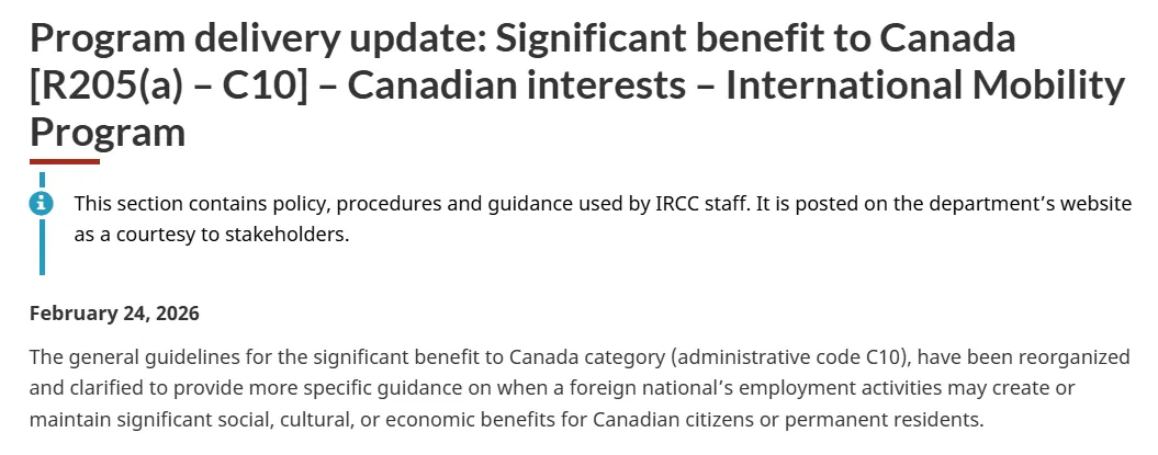 2026年2月24日,IRCC重写了R205(a) C10 – Significant Benefit(对加拿大的重大利益)的操作指引。这不是“优化”,而是明确堵死创业替代通道。从SUV关停、C10收紧,到未来创业试点预告,政策方向清晰无比: