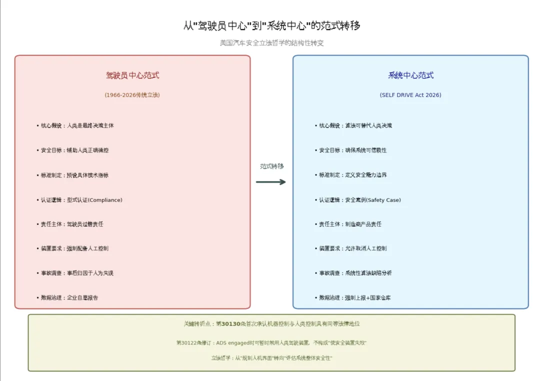 《SELF DRIVE Act of 2026》的里程碑意义,正在于它首次系统性地完成了从"驾驶员中心"到"系统中心"的范式转移。