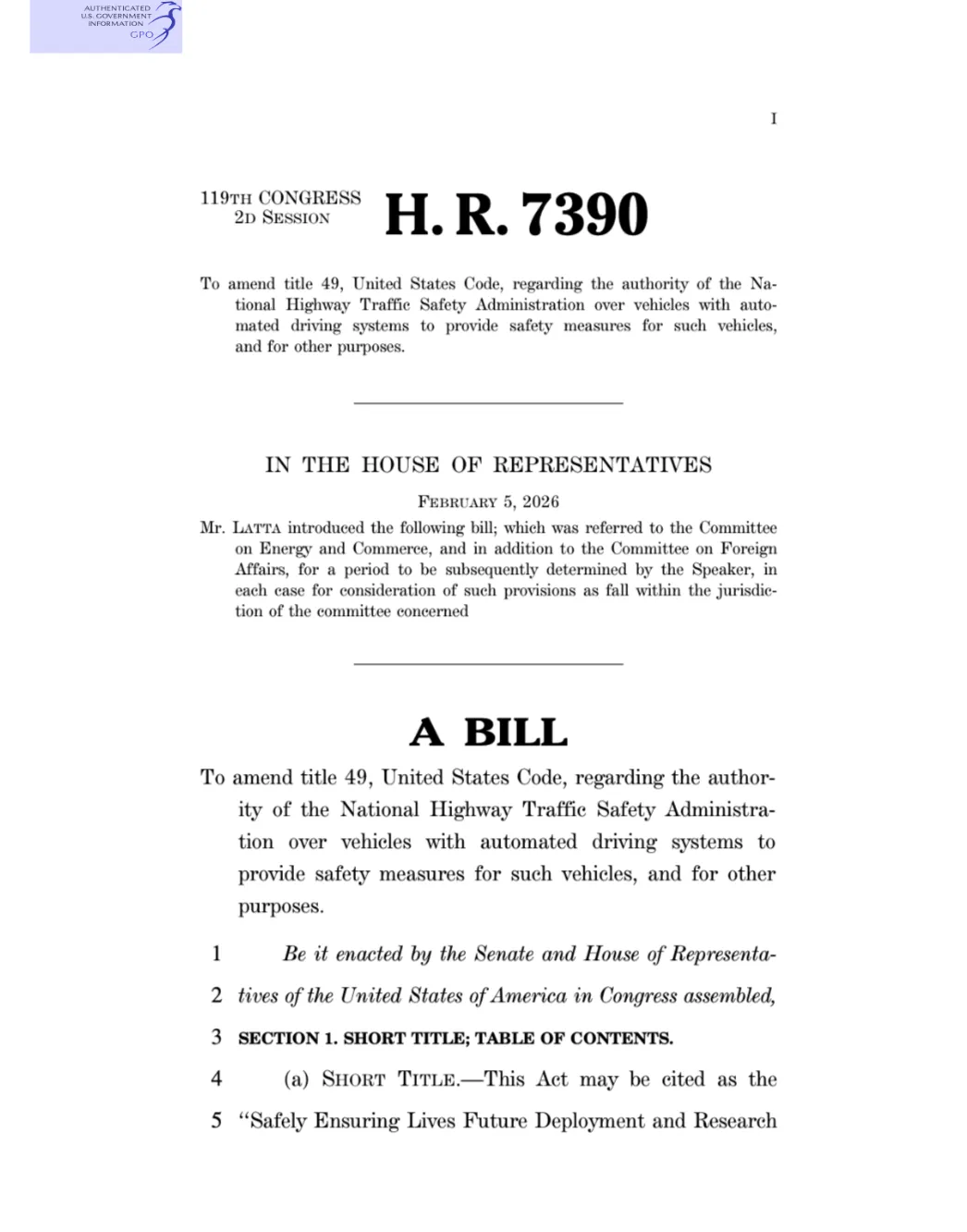 2026年2月,俄亥俄州共和党议员鲍勃·拉塔向众议院提交H.R.7390号议案时,美国汽车安全立法正站在一个历史性的十字路口。这份《Safely Ensuring Lives Future Deployment and Research In Vehicle Evolution Act of 2026》的缩写"SELF DRIVE"看似直白,实则暗含深意——它标志着美国立法者终于承认,继续用1966年《国家交通与机动车安全法》的框架来规制自动驾驶车辆,就像试图用蒸汽时代的铁路法规管理航空运输一样不合时宜。