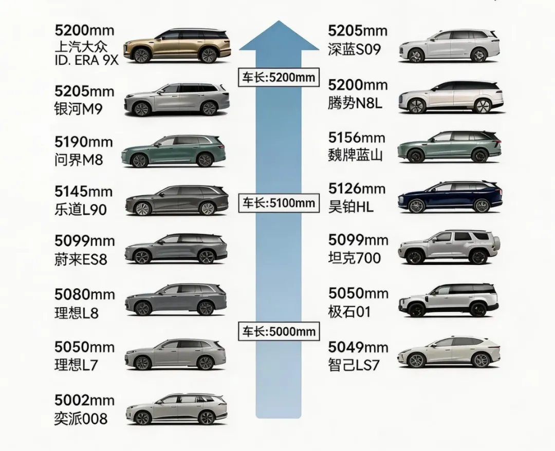 过去几年,七座SUV迅速迈入5200mm时代。上汽大众ID.ERA 9X 5207mm、吉利银河M9 5205mm、深蓝S09 5200mm、腾势N8L 5200mm、问界M8 5190mm,5米以上成为常态,5.2米成为新门槛;再往下,魏牌蓝山、蔚来ES8、理想L8、理想L7、坦克700、极石01、智己LS7、奕派008同样密集分布在5米区间。当尺寸全面拉平,数字带来的优越感迅速贬值。