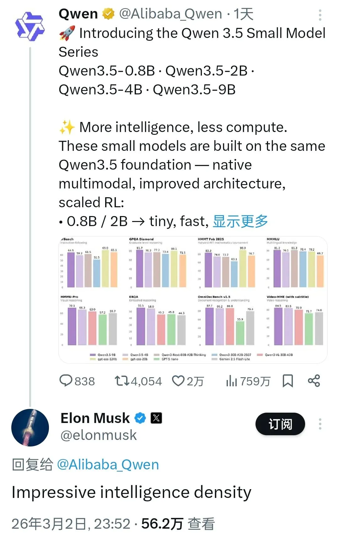 阿里Qwen新发布的小尺寸模型收获一众好评,马斯克也在评论区点赞