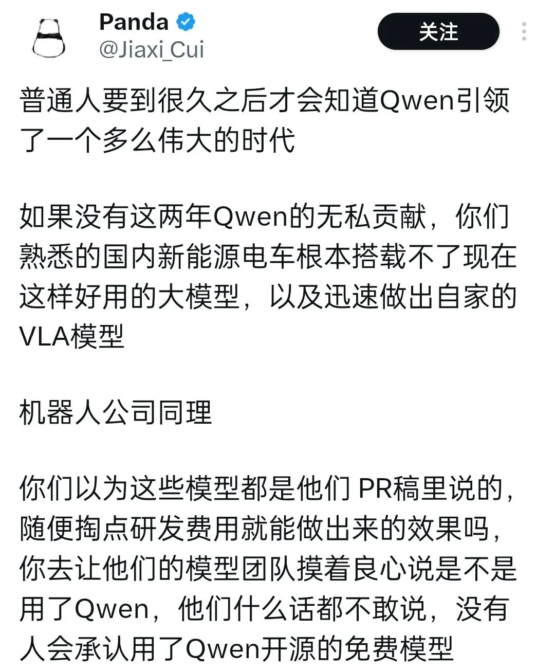 不管怎样,自动驾驶和机器人行业需要感谢Qwen的贡献,国内几家做自动驾驶vla方案的在“L”部分确实都用到了Qwen,本来也无可厚非,有这么好的开源模型,何必再自己弄个新的呢