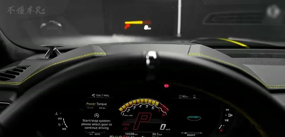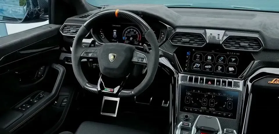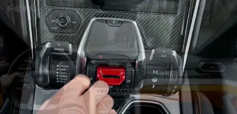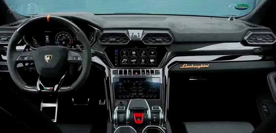 打开车门,你会发现Urus的内饰完全是战斗机座舱的风格。大量的碳纤维材质、Alcantara包裹,以及那个标志性的红色启动按钮,无时无刻不在提醒你这是一台兰博基尼。