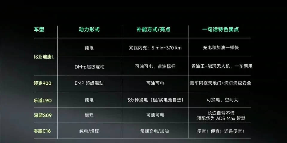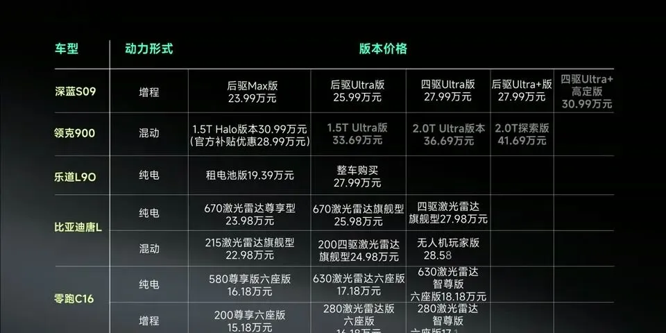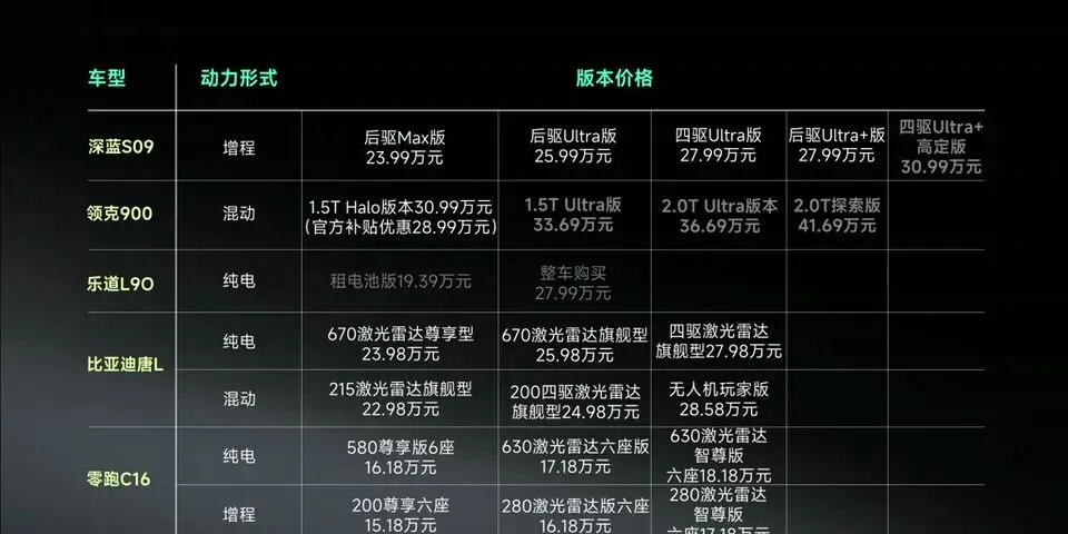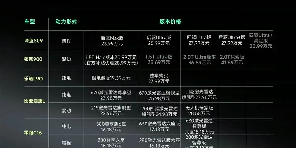 说实话,这个价位现在已经卷到不行。深蓝S09、领克900、乐道L90、比亚迪唐L、零跑C16,五款热门选手直接开打。