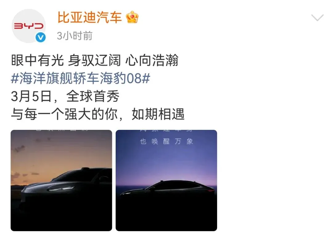 另外,年内比亚迪海洋网还将推出海豹08和海狮08两款车型,两款新车定位海洋8系双旗舰,海豹08定位旗舰轿车,海狮08定位旗舰SUV,基于800V高压平台打造,搭载第二代刀片电池。近日,比亚迪官方宣布,旗舰轿车海豹08将在3月5日全球首秀。