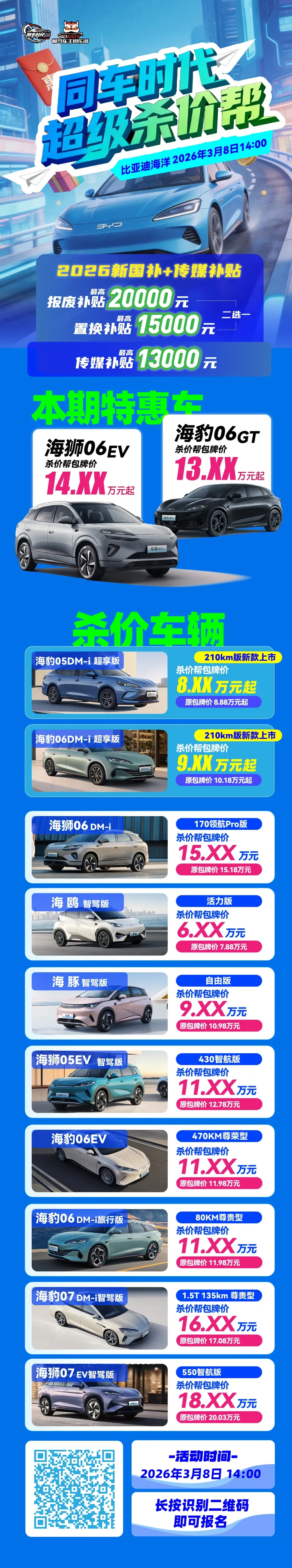 在比亚迪王朝网旗舰SUV“大唐”与海洋网双旗舰“海豹08/海狮08”即将惊艳亮相的同时,比亚迪也为广大消费者准备了实实在在的购车惊喜!本周日(3月8日),比亚迪海洋网“杀价帮”活动火热来袭,多重福利叠加,热门车型限时特惠,助您轻松开启高品质纯电出行生活!
