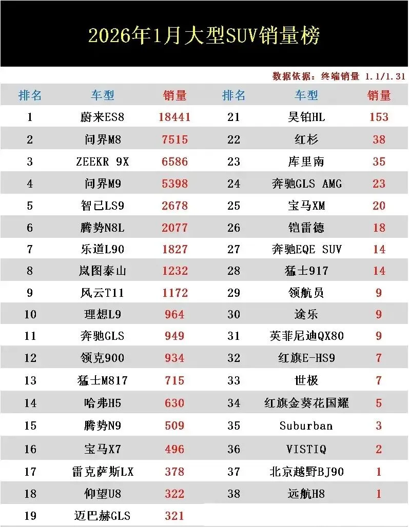 导读:看完2026年1月高端大型SUV终端销量排行榜,给人印象最为深刻的就是市场排名已彻底变天了,自主品牌车型已成功占据榜单主导,销量力压曾经长期统治这一细分市场的外资与合资品牌车型。其中蔚来ES8、问界M8、智已LS9、乐道L90、风云T11等多款国产新能源车型月销量均实现破千,把所有外资品牌车型远远甩在身后。不过德系品牌在高端大型SUV市场仍然保存有一定的竞争力,比如奔驰GLS排名第11,宝马X7排名第16,这两款车型本月也都交付了496辆和949辆新车,虽然不及巅峰时期,但依然是大型SUV市场的销量支柱。从整体竞争格局来看,外资品牌生存空间正在被国产新能源车型一点点蚕食,多款车主流车型都在面临着巨大的挑战。变天了!1月大型SUV销量榜:蔚来ES8夺冠,问界M9第4,宝马X7第16