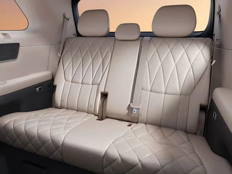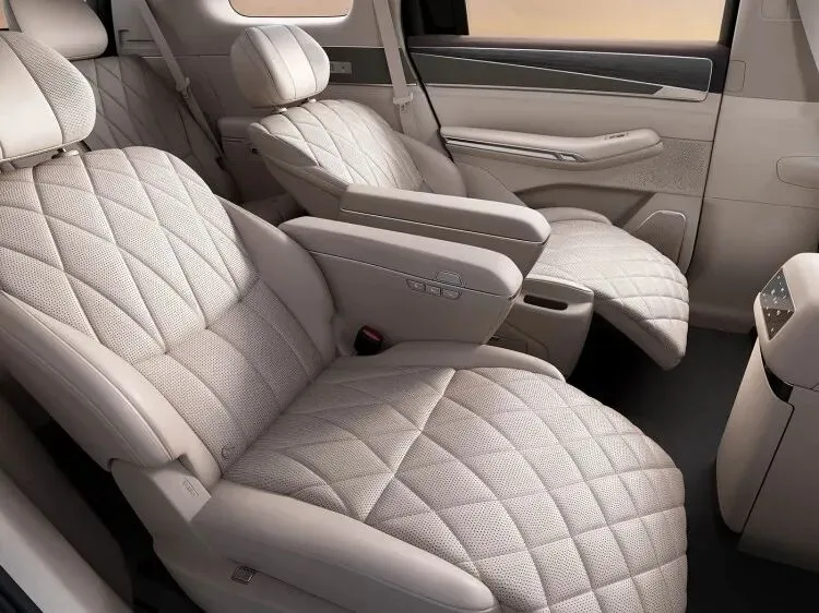 比亚迪大唐采用2+2+3的7座布局,两排类似两张零重力座椅,均带有独立扶手和腿托,扶手内侧还设置了调节座椅的物理按键,包括二排小桌板、吸顶屏、车载冰箱等配置也都一应俱全。