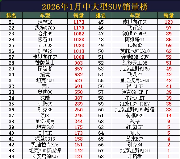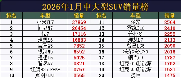 中大型SUV大洗牌!1月销量榜排行,问界M7亚军,银河M9第6,豹8仅第37