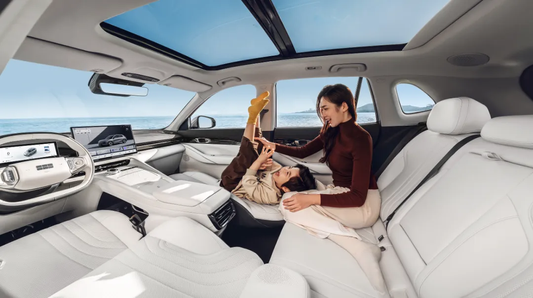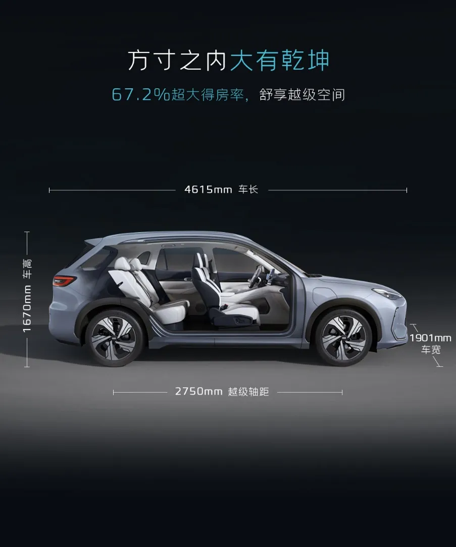 吉利银河E5拥有A级车的4615×1901×1670mm车身尺寸和2750mm的轴距,却带来B级车的空间体验。高达67.2%的超大“得房率”,1891mm的舱内有效车长,让身高1.8m的乘客坐在后排,也能随意翘起二郎腿。车内使用面积可达4.03㎡,比同级多一张办公桌的面积。