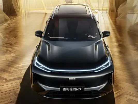 看到银河M7的第一眼,你会发现它和之前的L7气质很不一样。它用上了更接近纯电车的封闭式前脸,中间那条贯穿的LED日行灯带,和两边上扬的大灯连在一起,看着挺精神,晚上点亮肯定有辨识度。