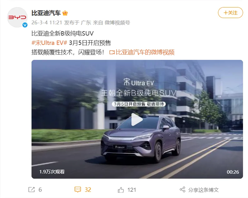 今日,比亚迪已经正式官宣,将在3月5日的深圳大运中心体育馆举办发布会,届时会发布比亚迪旗下王朝首款 B 级纯电 SUV 宋 Ultra EV ,并开启预售,同时也将发布第二代刀片电池暨闪充技术。