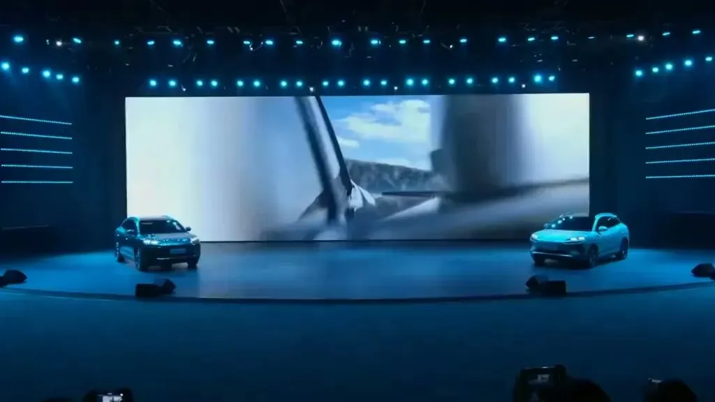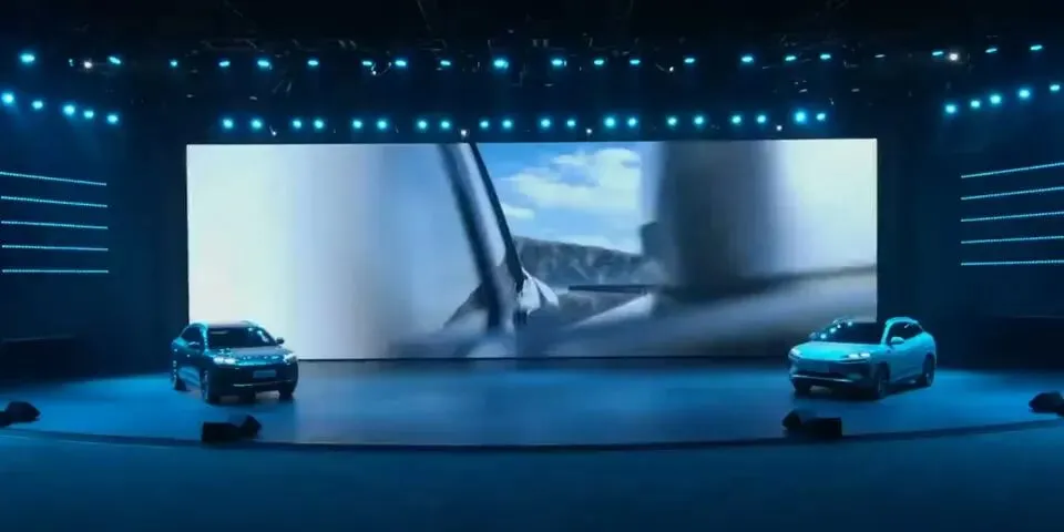 比亚迪海狮06车型发布会,两款车型在蓝色灯光下展示。