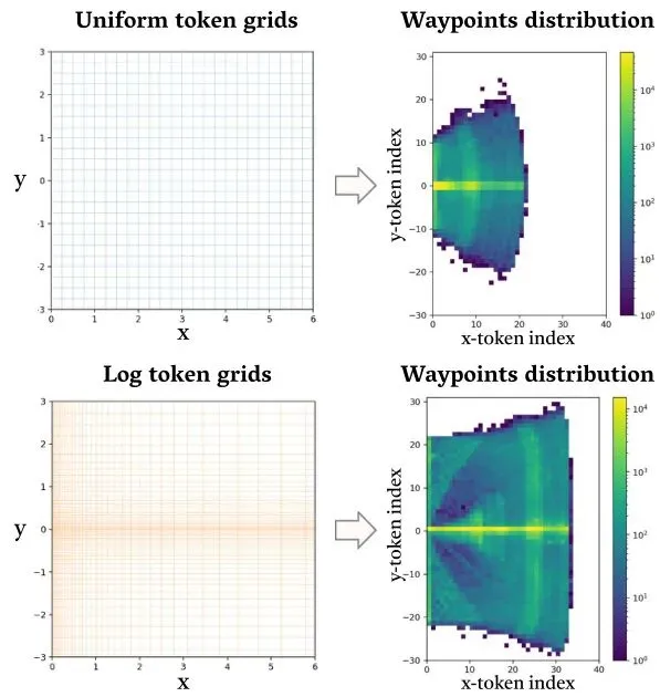 过去的VLA模型,语言和动作是两套系统。语言走LLM的文本词表,动作要么是连续的坐标,要么是另一套编码。这就像两个人在用不同的方言交流,容易产生误会。LinkVLA的解决办法很彻底:创造一个“普通话”码本。它把车辆前方鸟瞰图(BEV)空间划分成网格,每个格子对应一个唯一的“动作token”。这样,一条连续的轨迹就变成了一串离散的token序列。然后,把这个动作码本和原本的语言词表直接拼在一起,形成一个超大的统一码本。现在,模型处理“向左变道”这句话和处理“向左前方第5格”这个动作token,从根本的表示层面上就在同一个空间里了。这就强制模型在底层编码时,就把语言概念和空间位置关联起来。简单的均匀网格划分有两个问题:1)对近处(需要精细控制)和远处(粗略即可)给了同样的分辨率,浪费;2)硬性的one-hot标签丢掉了网格间的空间邻近关系。