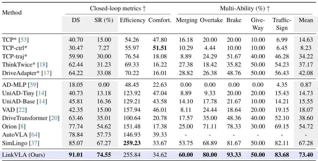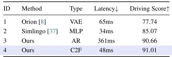 LinkVLA在自动驾驶领域权威的仿真平台CARLA上进行了闭回路评测,对比了包括TCP、UniAD、VAD、Orion、SimLingo等在内的众多SOTA方法。表1:在Bench2Drive基准上的主要结果和多能力评估。*表示使用了专家特征蒸馏。驾驶性能:LinkVLA取得了最高的驾驶得分(91.01)和成功率(74.55%),全面超越了之前的SOTA模型SimLingo(85.07和67.27%)。在变道、超车、刹车等各项交互能力上,LinkVLA也几乎都取得了最佳成绩。表2:性能与延迟对比。所有指标均在CARLA基准上评估。延迟是每步的平均推理时间,在H20 GPU上测量。推理效率:这是LinkVLA最亮眼的数据之一!如果不使用C2F方法,LinkVLA的自回归版本虽然性能高(驾驶得分90.66),但延迟高达361ms。而启用C2F后,延迟骤降至48ms,同时驾驶得分还提升到了91.01。对比最强的竞品Orion(65ms,得分77.74),LinkVLA在性能高出13.27分的同时,延迟还降低了26%。相比于最快的SimLingo(34ms),LinkVLA以仅增加14ms延迟的代价,换来了5.94分的性能大幅提升。C2F带来的加速效果高达约86%!指令跟随能力:论文在专门的指令跟随数据集上进行了测试。结果表明,逐步引入Token化、C2F和对齐训练,指令跟随成功率从70.11%稳步提升至87.16%。尤其是在“加速”、“变道”等具体指令上,LinkVLA展现出了惊人的准确率。表3:在Action Dreaming数据集上的指令跟随评估。Align.指统一对齐训练。消融实验:每个组件贡献几何?