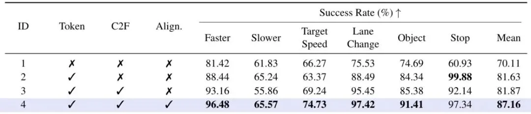 为了验证每个“法宝”的效用,论文做了详尽的消融实验。表5:闭回路性能消融研究,对比了我们提出的不同组件。