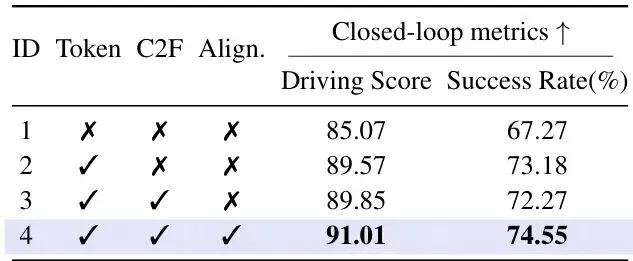 统一Token化是性能基石:仅引入Token化(ID 2),驾驶得分就从基线的85.07大幅提升至89.57,成功率从67.27%提升至73.18%。这说明将动作离散化并与语言统一表示,本身就是一项强大的性能提升手段。