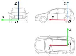 车辆坐标系又称车身坐标系,原点一般为车辆的质心,或者后轴的中点。X轴指向车头前方,Y轴指向驾驶员的左侧,Z轴垂直于车身指向上方。