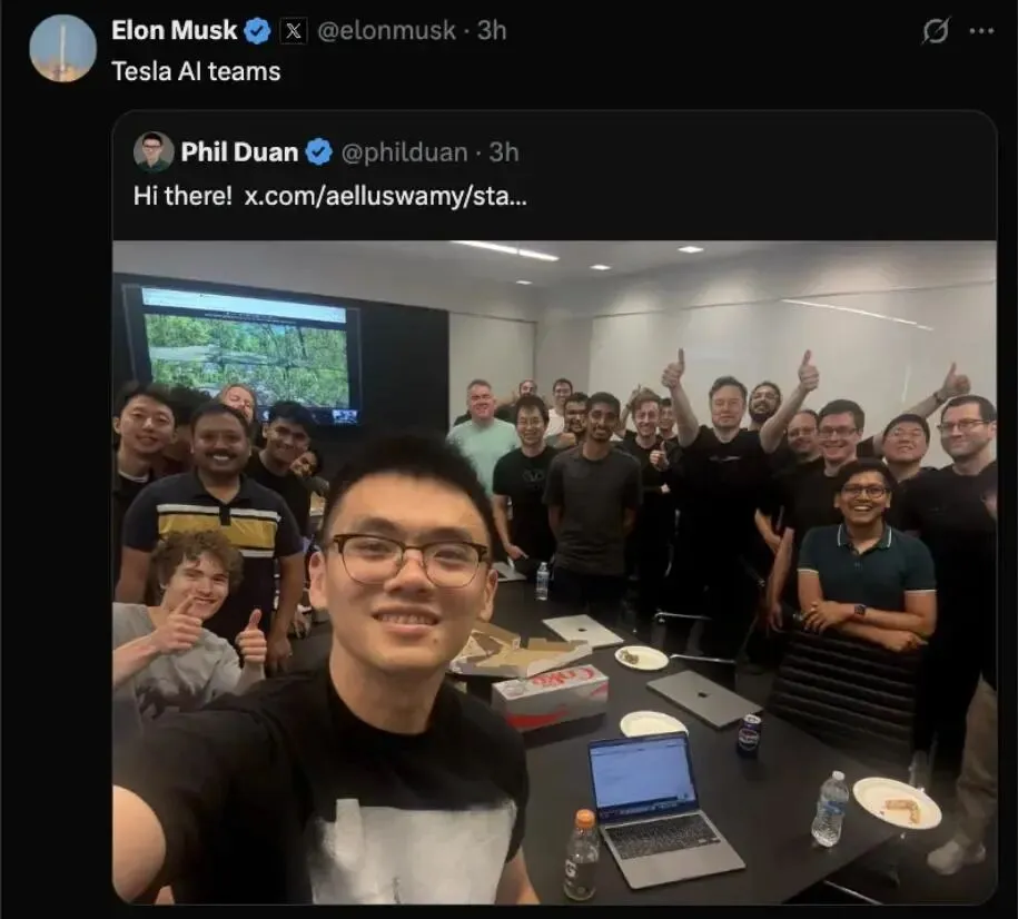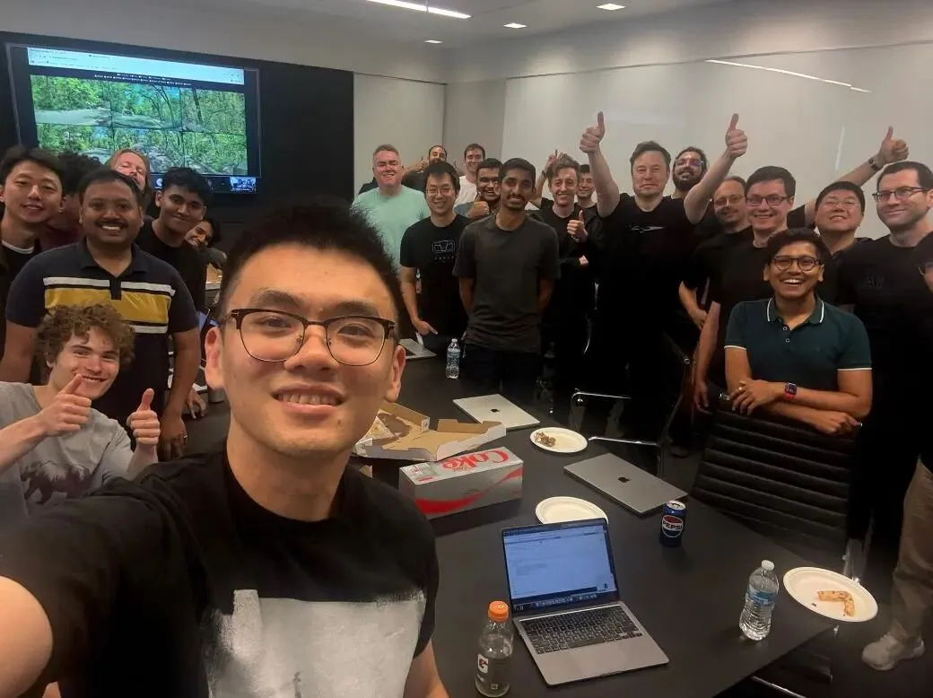 马斯克在X平台上对此大力称赞,还转发了办公室庆功派对的大合照,照片中那个负责拍照的中国面孔就是段鹏飞。