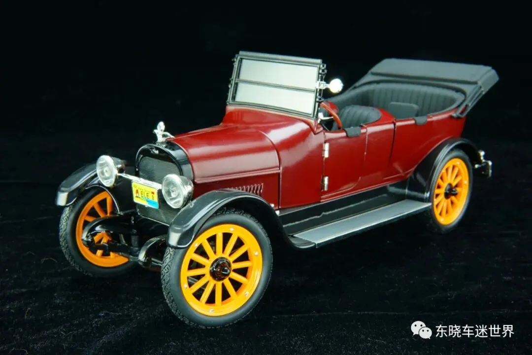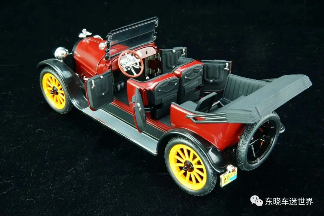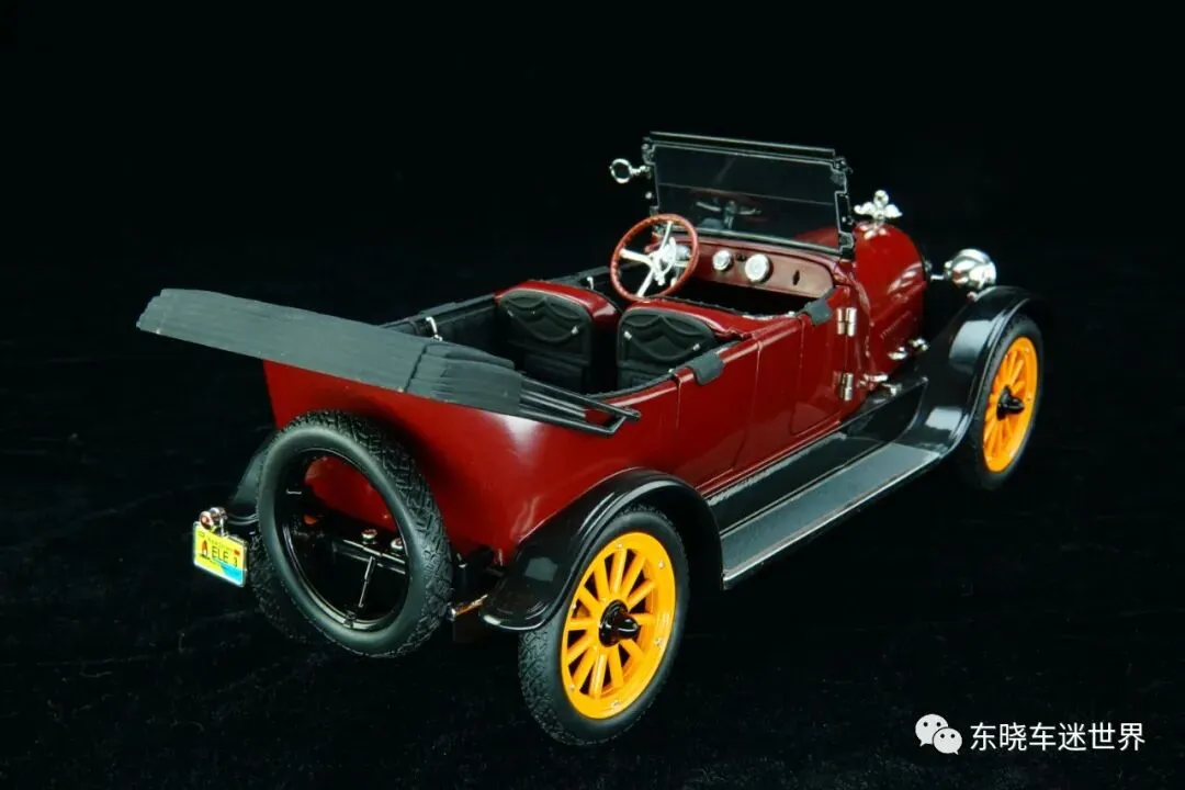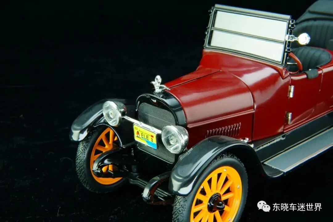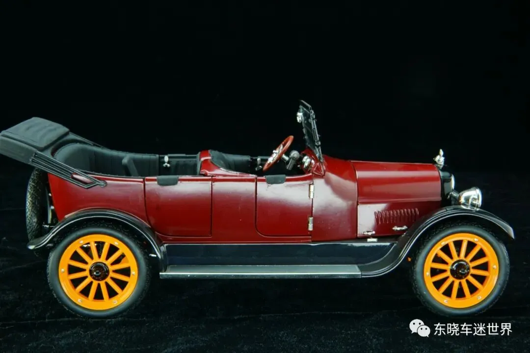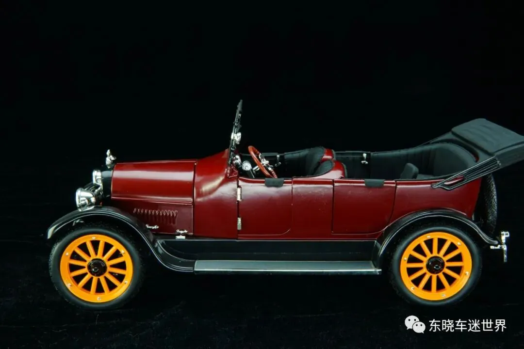 从模型细节来看,它拥有宽敞的双排座椅,后排甚至贴心地设计了儿童专用座位,体现了对家庭出行的重视。车身采用深红色涂装,搭配黑色挡泥板和亮橙色轮毂,色彩搭配复古而醒目。在1917年,这款四缸车型的起售价约为875美元,对于当时的美国家庭来说,它不仅是一台交通工具,更是身份与品味的象征。