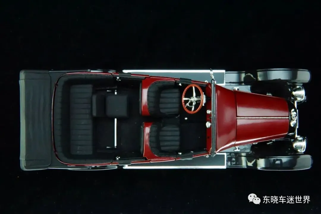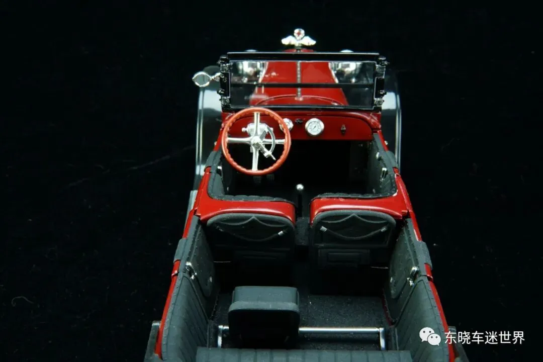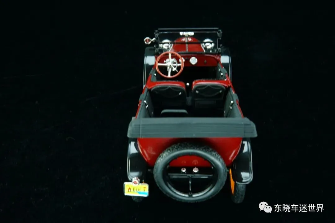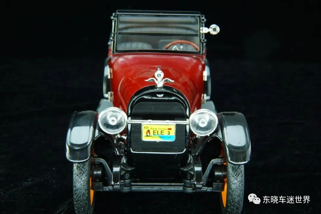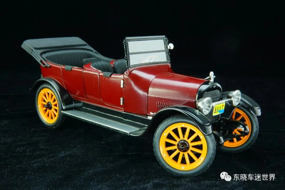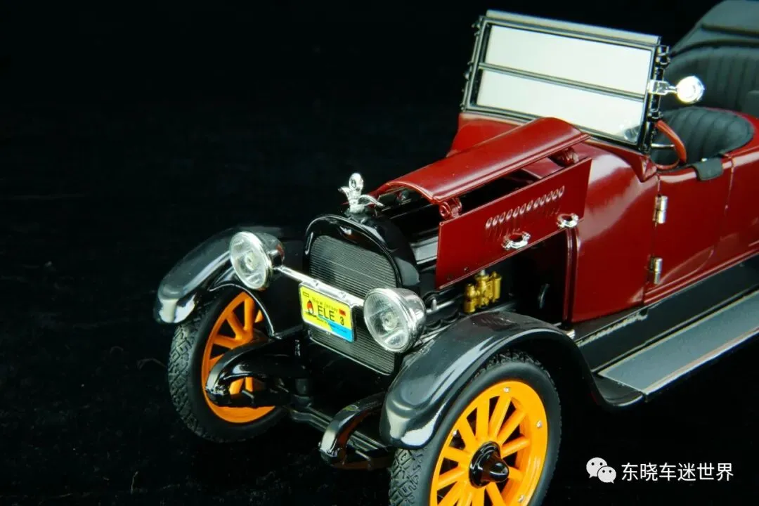 从模型细节来看,它拥有宽敞的双排座椅,后排甚至贴心地设计了儿童专用座位,体现了对家庭出行的重视。车身采用深红色涂装,搭配黑色挡泥板和亮橙色轮毂,色彩搭配复古而醒目。在1917年,这款四缸车型的起售价约为875美元,对于当时的美国家庭来说,它不仅是一台交通工具,更是身份与品味的象征。