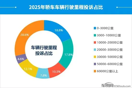 在2025年轿车车辆行驶里程投诉统计中,行驶里程60000公里以上出现问题的投诉占比最高,达到28.6%,相比2024年降低了3.6个百分点。值得注意的是,行驶里程在10000公里以内的投诉占比提升明显,已超过总量的三成,较2024年增加了8个百分点。