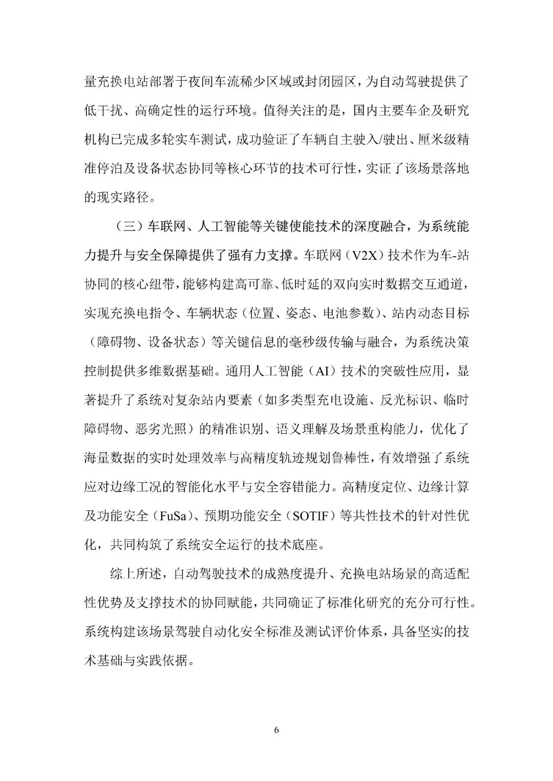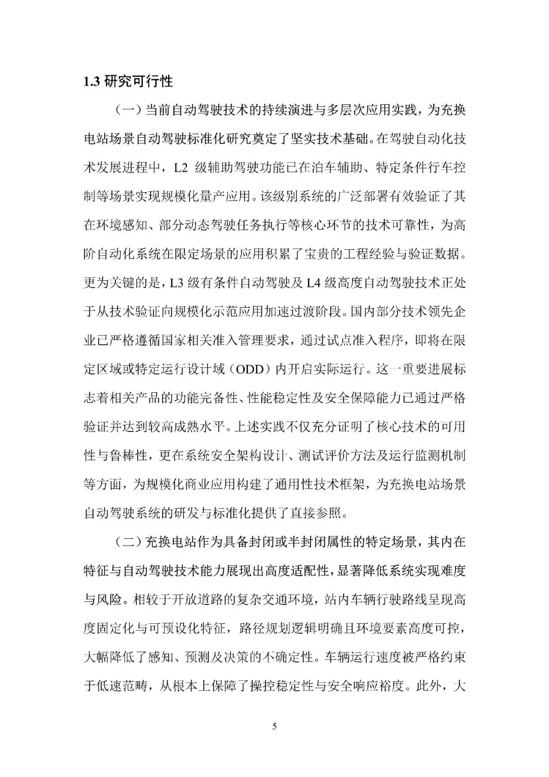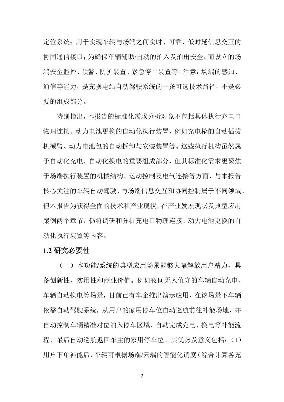本研究以充换电场景下的自动驾驶应用作为研究对象,通过总结调研当前产业相关应用的发展现状,分析现有标准法规对于典型应用的适用性,梳理当前标准体系中尚未标准化的各类特殊场景需求,形成了修订已有标准、完善制定中标准、制定新的标准指南等标准化建议。