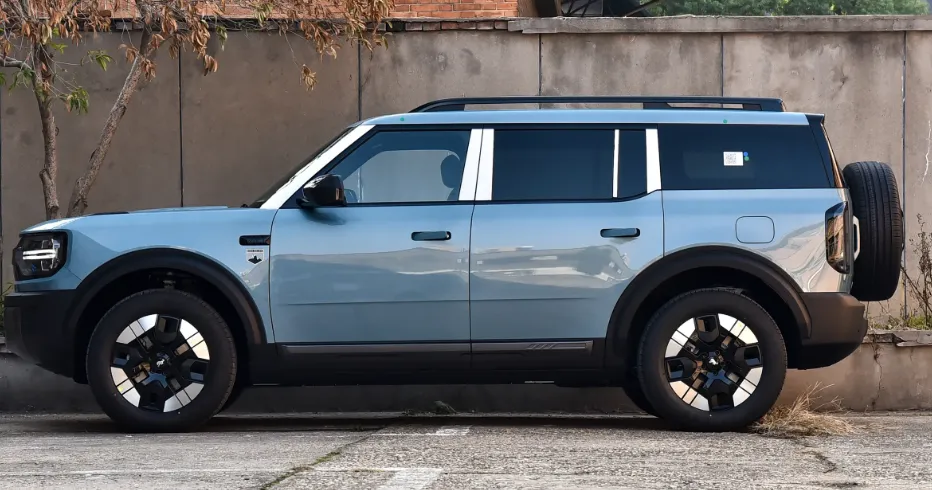 外观方面,福特智趣烈马延续了烈马家族方盒子的造型,没有多余的圆润线条,车身尺寸5025x1960x1825mm,轴距2950mm,往那一摆视觉压迫感就来了。前脸是标志性的贯穿式灯组加熏黑处理,点亮之后确实挺精神。底部有厚实的金属防护结构,然后黑色防护面板一直连到侧面轮眉和底裙,户外越野不用担心剐蹭。侧面带车顶行李架和尾部小背包,配合大尺寸铝合金轮毂,整体霸气运动的氛围拉满了。然后整车风阻系数做到了0.38Cd,在方盒子车型里这个数据还是蛮有竞争力的。我个人比较喜欢那个背负式备胎的设计,这就是硬派SUV该有的样子。隐藏式门把手紧急情况能自动弹出这个也是蛮良心的。