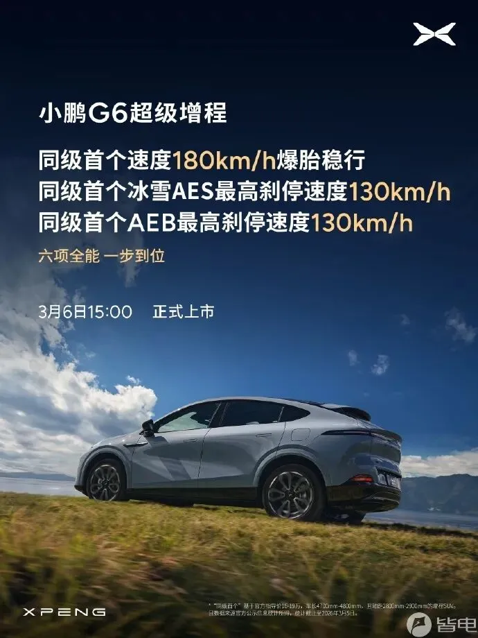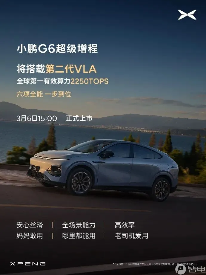3月5日消息,小鹏汽车官方今日宣布,小鹏 G6 超级增程轿跑 SUV 将在 3 月 6 日 15:00 上市,宣称“六项全能 一步到位”。新车纯电续航430km,综合续航可达1704km。同时,新车将搭载第二代VLA。