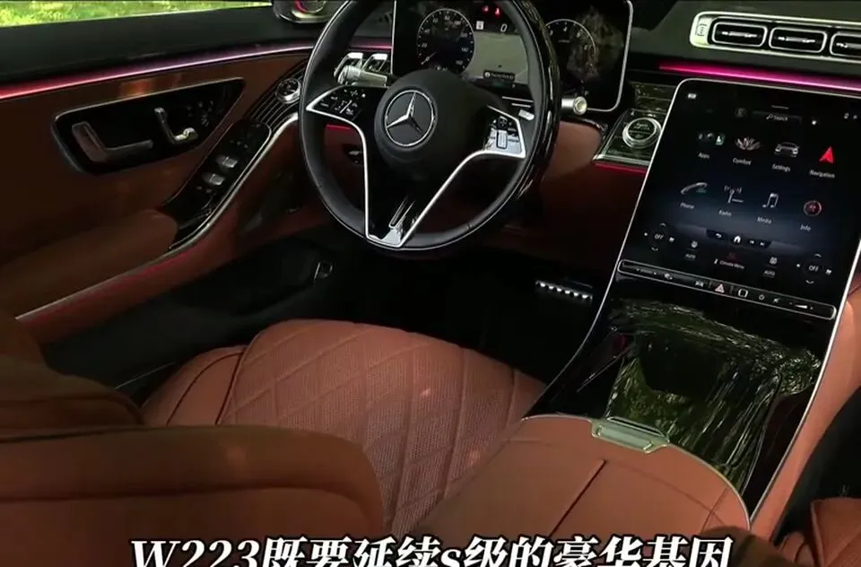 奔驰S级的内饰,是棕色真皮、木纹饰板,再配一块12.8英寸OLED竖屏。