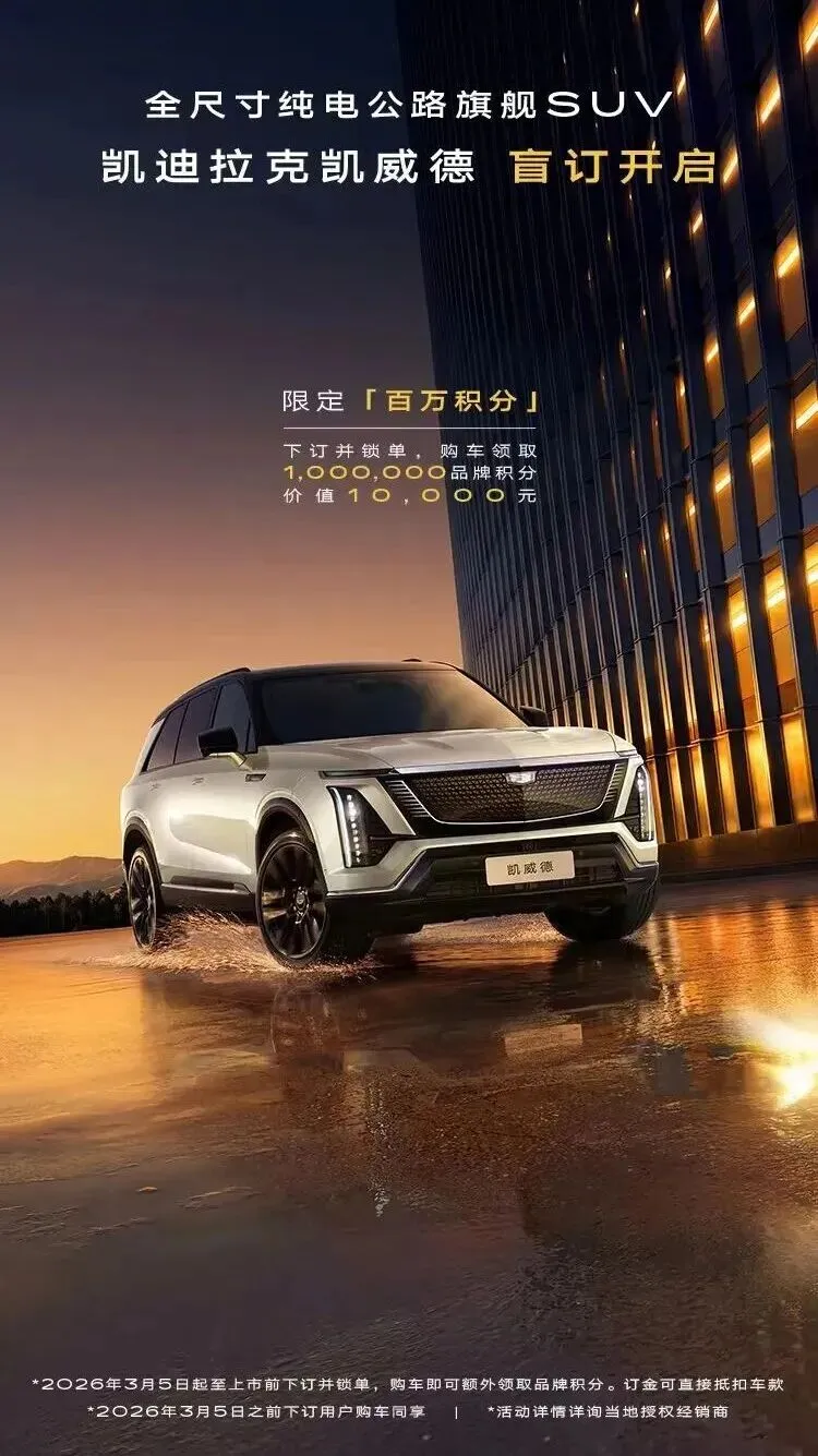 目前,凯威德的正式售价尚未公布,这也是大家最关心的问题之一。作为一款全尺寸纯电豪华旗舰SUV,她的定位大概率会对标同级纯电车型。虽然定价未出,但凯迪拉克已经为心仪这款车型的用户,推出了一项诚意满满的福利——百万积分。即日起至凯威德正式上市当天,下定并锁单购车的用户,即可领取1,000,000积分。对于凯迪拉克的老用户而言,这些积分可以兑换保养、配件等服务;对于新用户来说,也能在后续的用车过程中,享受更多便利,这也从侧面体现了品牌对这款旗舰车型的重视,以及对用户的诚意。综合来看,凯威德是一款“有传承、有实力、不浮夸”的纯电旗舰。她延续了凯雷德的传奇血脉,保留了凯迪拉克的豪华基因,同时在纯电动力、科技配置、操控体验上完成了进化,既满足了人们对全尺寸豪华SUV的气场需求,也适配了纯电时代的出行趋势。当然,这款车型也还有不少悬念,比如具体的续航表现、辅助驾驶的实际体验、正式售价等,都需要等到上市后才能一一揭晓。对于追求豪华质感、注重实用体验,且对全尺寸纯电SUV有需求的消费者来说,凯威德无疑是一个值得关注的选择。后续Auto Fashion将持续关注这款车型的动态,为您带来更全面、更客观的解读。