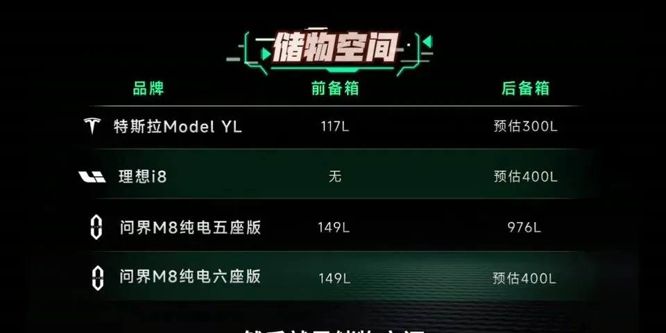 问界M8就有点夸张了:前备箱149L,五座后备箱976L。