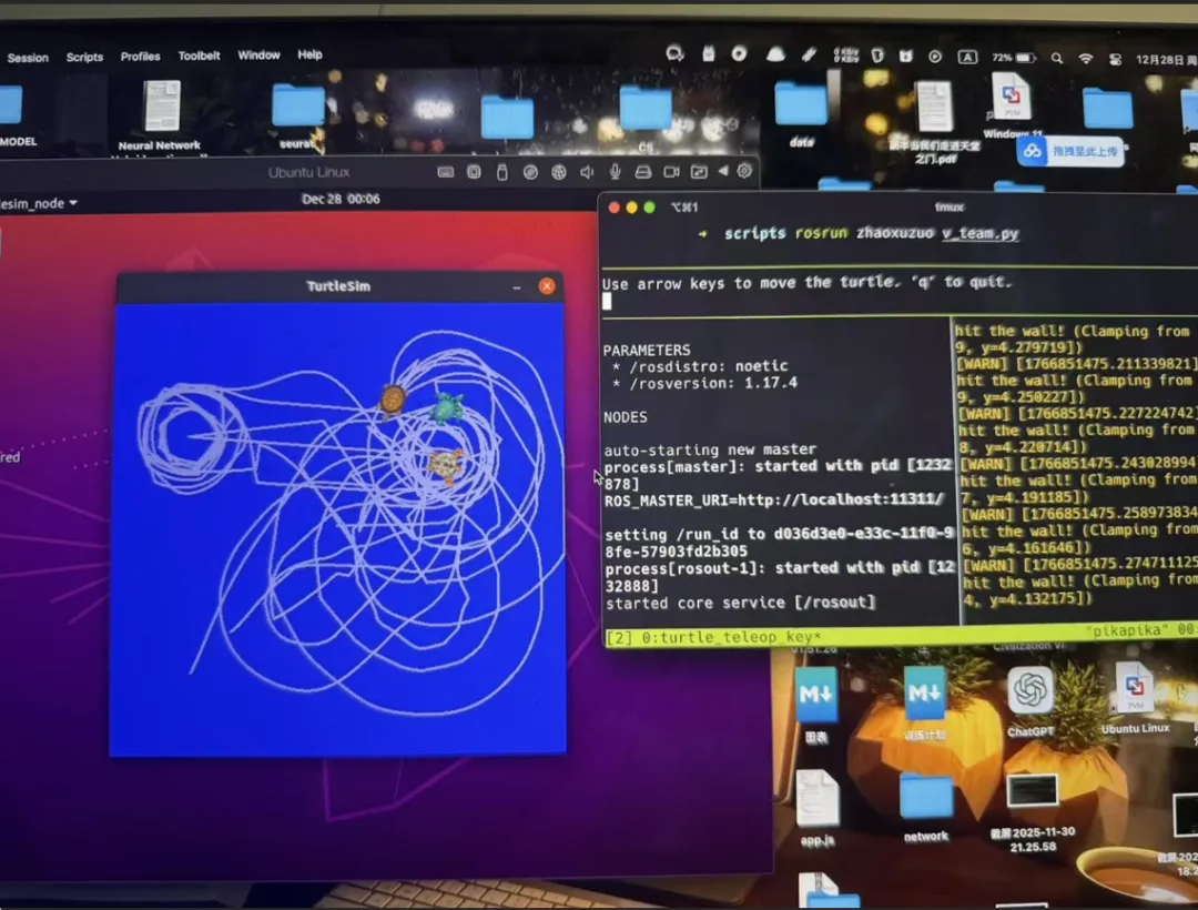 Multi-Agent Coordination (V-Formation Following): To achieve the formation flight of three turtles, the key was to establish independent dynamic reference frames for the two follower turtles. This was quite challenging for me, a beginner just exposed to ROS coordinate transformations. After repeated debugging, I finally succeeded in getting the code logic to work.