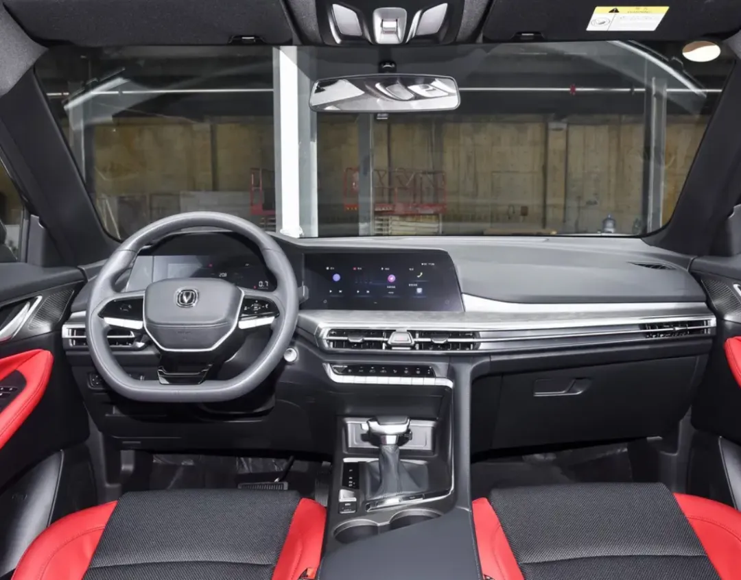 坐进车内,内饰布局很有个性。双联屏做成了曲面设计,中间有一道分割,看着挺新鲜。中控台保留了一排实体按键,新手盲操作也很方便。车里用了不少拉丝面板和仿皮包裹,摸上去手感不错。中配车型带有一个小天窗,车机支持语音唤醒,还配了恒温空调和PM2.5过滤系统。可以说,长安在几万块的车上也是配置拉满的典范。座椅坐着很软,包裹感很强,开长途也不会觉得累,家里老人坐着也舒服。