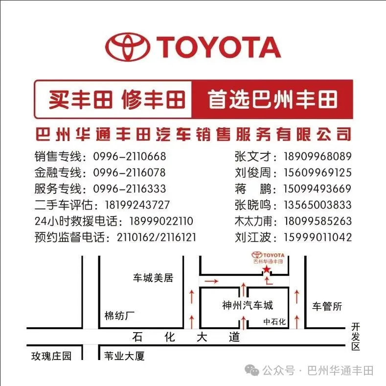 公司地址:库尔勒市石化大道神州汽车6号展厅巴州华通丰田4s店