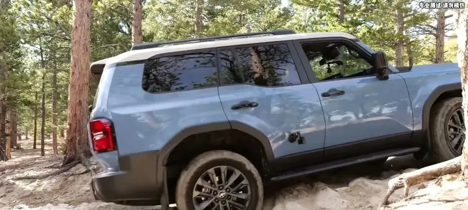 兰德酷路泽LC250前轮抬起,离去角不足导致车尾接近地面。