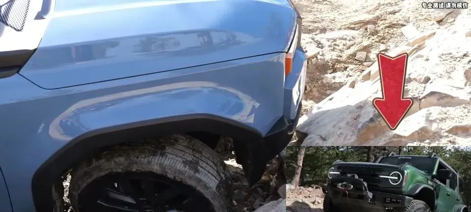 福特烈马和兰德酷路泽LC250在岩石路段进行越野性能对比测试。
