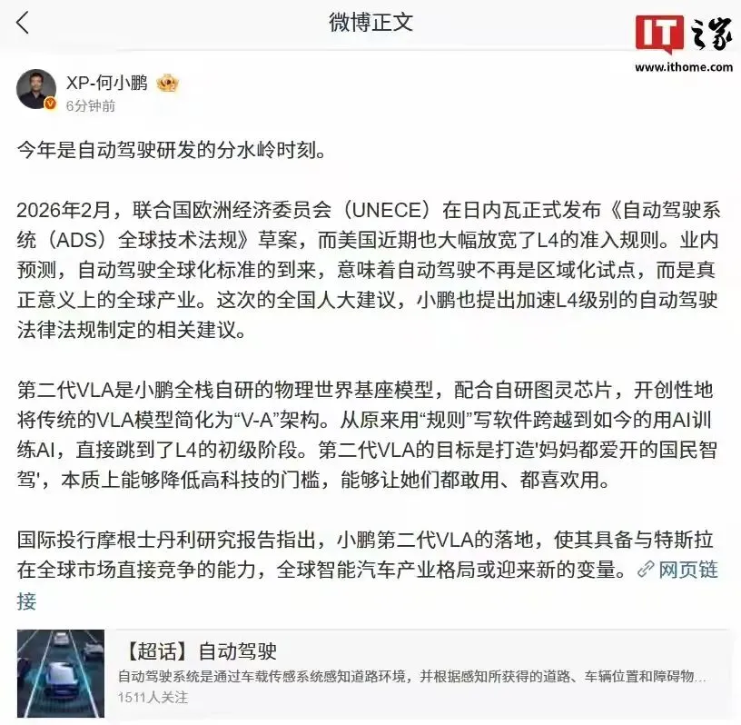 在3月2日的媒体体验日上,何小鹏公布了自己的两会建议:加快推动自动驾驶从L2跨越到L4,完善法规与管理政策。