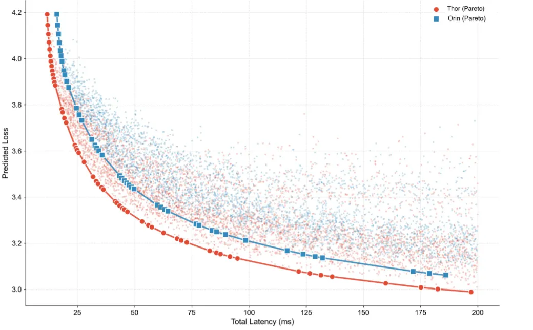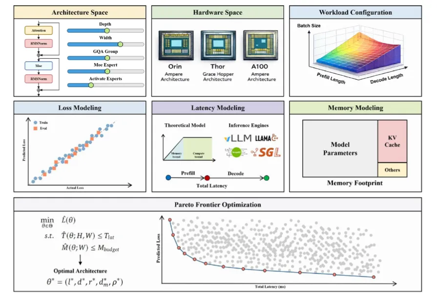 在此基础上,结合上述两个式子就诞生了PLAS(帕累托最优LLM架构搜索)框架,从而实现了协同设计。在公式中,只需要输入芯片的算力、带宽、缓存层次,以及工程约束(例如延迟<100ms、功耗、内存),自动生成最优的模型架构方案——找到“在当前硬件上,精度最高、延迟最低的那条边界”。简单来说,就是能同时找到算法能力和芯片设计的共同最优解。
