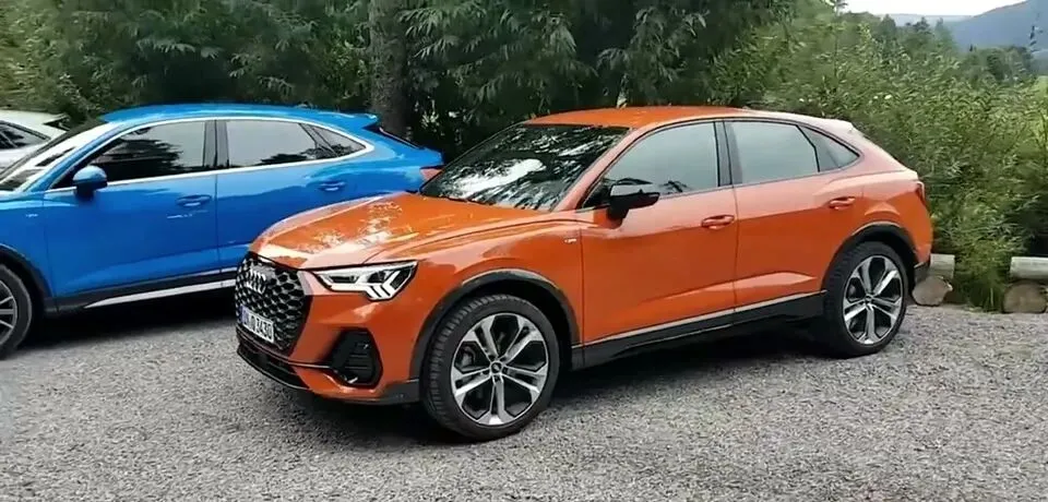 先看蓝色奥迪Q3的车身展示,整体造型紧凑干练。紧接着是橙色车身版本,同样是外观展示。