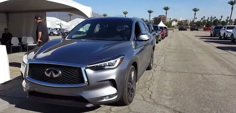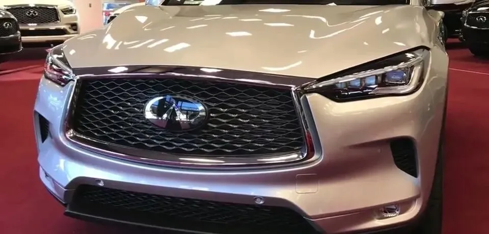 “展示灰色英菲尼迪QX50车头,这是一款中型SUV,车长超过4米7,轴距接近2米8,空间方面优势不大,但是动力方面直接完胜宝马X3。”